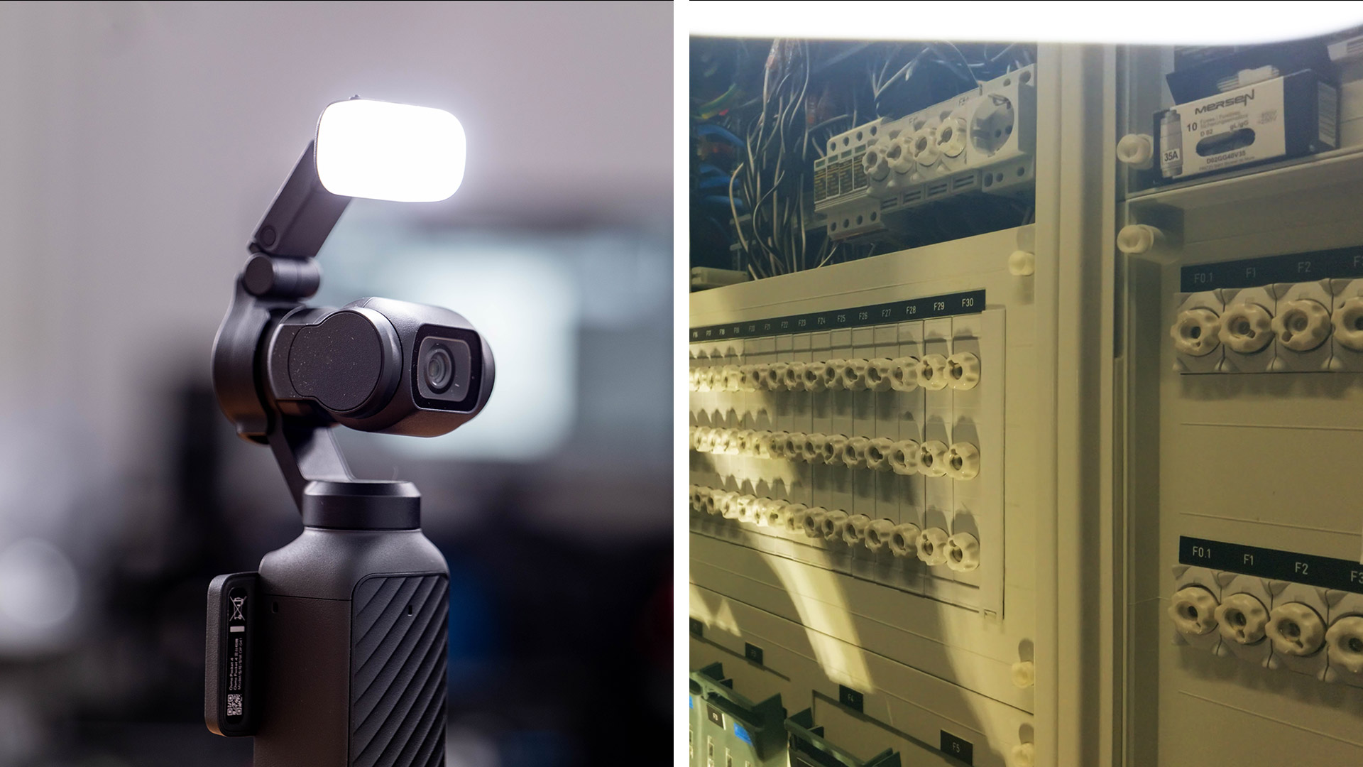 Praktisch ist aber nicht nur die mitgelieferte Gimbalsperre für den Transport, sondern auch die eingangs erwähnte aufsteckbare Leuchte (exklusiv in der Creator Combo), welche mittels zwei Tasten in drei Farbtemperaturen (2800/4000/5500 Kelvin) und ebenso vielen Helligkeitsstufen (12/25/40 Lux, gemessen in 60 cm Entfernung) eingestellt werden kann. Vor allem bei Vlog-Aufnahmen bei Dunkelheit macht die Leuchte einen guten Job als Kopflicht und auch in dunklen Drehumgebungen nimmt man die Lampe gern zur Hand, solange das Objekt nicht zu weit entfernt ist. Einziges Manko: In gewissen Neigungswinkeln ragt das Licht in das Bild hinein, da die Haung nicht genug Kippwinkel nach hinten besitzt.
