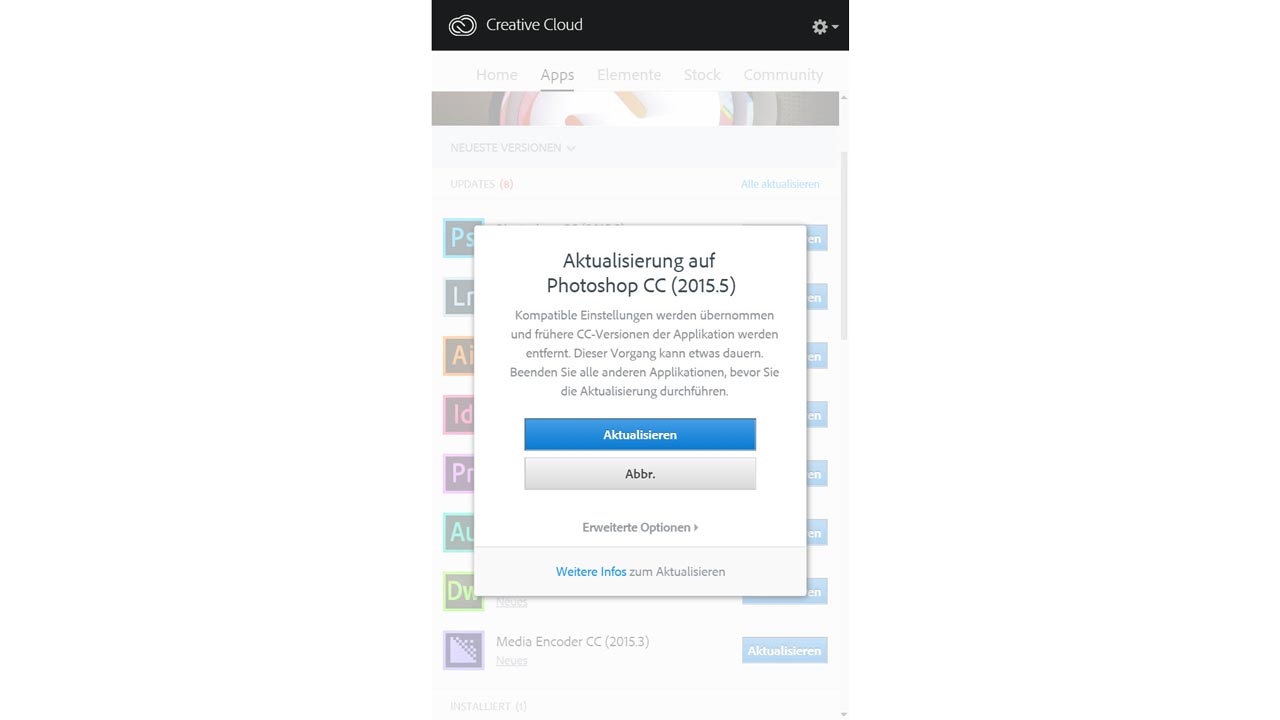 Beim neusten Update handelt es sich um ein großes Update, wobei Adobe offensichtlich den Updateablauf verändert hat: Jetzt bekommt man eine Warnung, dass beispielsweise Premiere Pro erneuert wird (auf Version 2015.3) und die alte Version entfernt wird. Bisher wurde diese immer noch bereit gehalten. Das Update der Creative Cloud mit den wichtigsten Hauptanwendungen tauschte satte 6717 Dateien das Update bei uns aus und benötigte bei uns gut zweieinhalb Stunden. Offensichtlich die meisten neuen Dateien tauscht Adobe bei Premiere Pro und dem Media Decoder aus. Eine der Nebenwirkungen: Die alten Anwendungen werden aus der persönlichen Startleiste gelöscht - die neuen muss man wieder händisch hinzufügen. Dennoch darf man darauf hoffen, dass das Schnittprogramm weit mehr Verbesserung erfahren hat, als die eine neue Funktion, die Adobe verkündet. Denn seit Version 2015 ist das Schnittprogramm immer noch nicht zur alten Stabilität zurückgekehrt. Apropos Update: Nach den Anwendungen aktualisiert die Creative Cloud noch einmal 22012 Dateien. Dieses Update benötigt noch einmal mehrere Stunden - komfortabel sieht anders aus. Wir und sicher viele weitere User sind über jede Praxiserfahrung dankbar - bitte einfach im Forum posten.