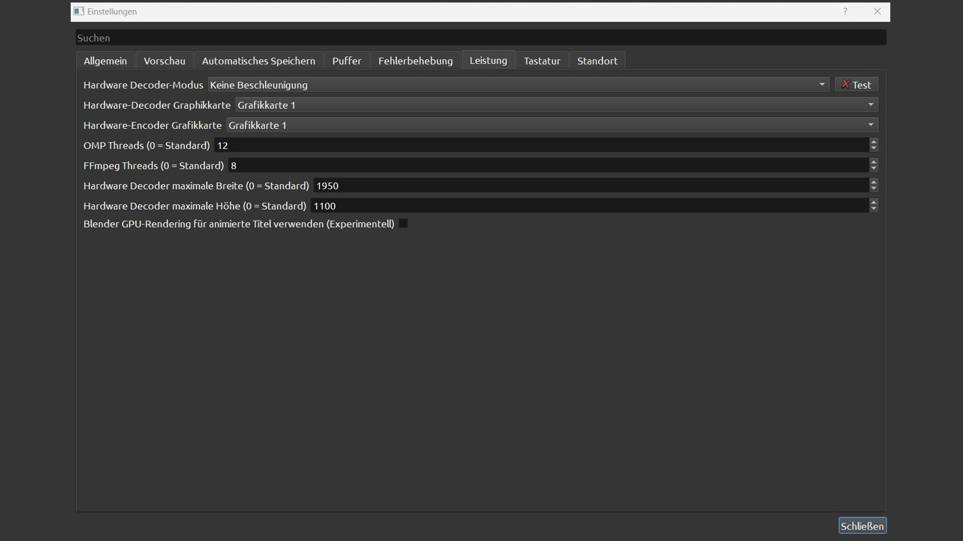 LEISTUNGUnter anderem bei der Leistungsfähigkeit haben die Entwickler für die neue Version des OpenShot 3.0 angesetzt und wollen das Caching für die automatische Hintergrundberechnung verbessert haben. Im Test hat dieses dann auch zumeist ordentlich funktioniert, allerdings erst, als wir in den Einstellungen unter „Puffer“ die Cache-Vorlaufzeit auf das Maximum gesetzt hatten und auch die Mindest- und Maximal-Zahl der für den Vorlauf des Cache zuständigen Frames erhöht hatten. Das ist dann natürlich ganz klar von der Leistungsfähigkeit des eigenen Systems abhängig, weshalb man hier selbst etwas experimentieren muss. Während unseres Tests konnten wir so insgesamt auf zwei bis drei UHD-50p-Spuren, auch mit Mischmaterial in 25p sowie Full-HD-Dateien und Hochkant-Material vom Smartphone, recht ordentlich arbeiten. Die Vorlaufszeit war flott genug, dass die Zeitnadel die Vorberechnung in der Regel nicht einholte und die Wiedergabe so nicht ins Stocken geriet. Manches Mal war das trotzdem der Fall, weshalb man dann pausieren und der Software einfach etwas Zeit für die Vorberechnung der einzelnen Szene lassen sollte. Geduld ist hier dann das Zauberwort. Auch wichtig: Unter Leistung sollte man für den Hardware-Decoder und -Encoder noch die dedizierte Grafikkarte oder die interne GPU des eigenen Systems festlegen.
