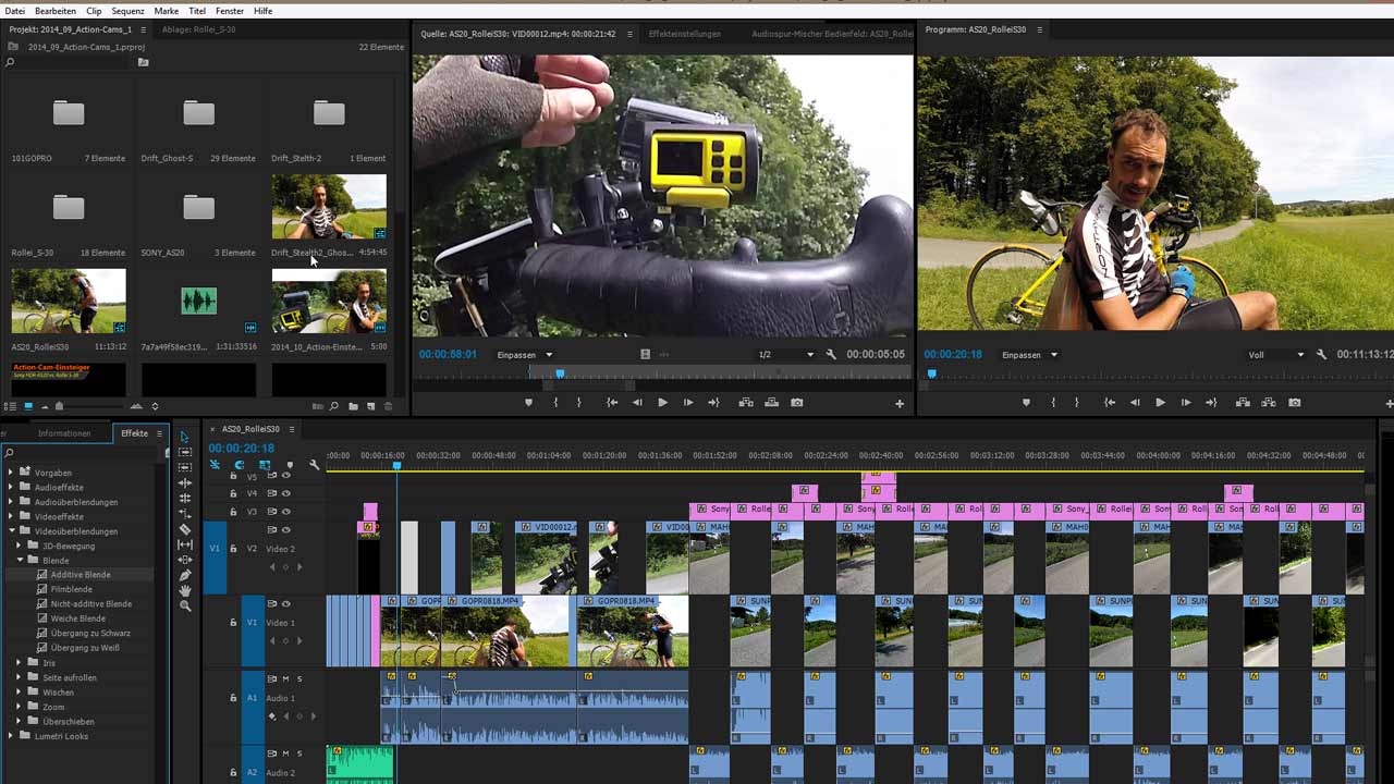 Allerdings haben ich via USB 3.0 eine SSD-Festplatte angedockt. Das hat zum einen den Vorteil, dass ich Projekte schneller austauschen und an unterschiedlichen Rechnern bearbeiten kann, zum anderen sprenge ich so nicht den eh schon knappen internen Speicher. Der Schnitt klappt flüssig, solange man auf ganz aufwändige Effekte verzichtet – doch eben das ist auch der Trick, wenn man ein solches Projekt innerhalb von zwei bis drei Stunden geschnitten haben möchte: Außer der Titelanimation gibt es noch weiche Blenden, ansonsten wird hart geschnitten.