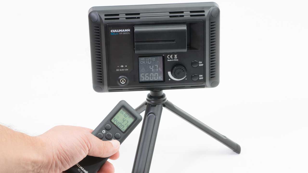 Bei der VR 860 DL leuchten hingegen immer alle 308 Tageslicht-LED. Der Clou an den beiden Leuchten: Sie lassen sich via mitgelieferter Fernbedienung steuern. Man kann sie dabei sogar in 16 Kanälen organisieren und zudem in sechs Gruppen aufteilen. Entsprechend kann man über einen Kanal mehrere Leuchten einschalten und über die Gruppe dann unterschiedlich regeln. Die Bedienung ist, nicht zuletzt wegen der übersichtlichen LCD-Anzeige, sehr einfach.