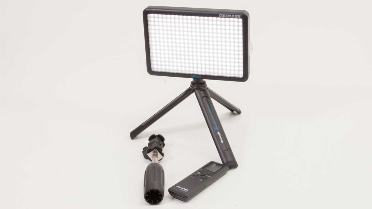 Im Lieferumfang sind das stabile Tischstativ Magnesit Copter, ein kleiner, leider nur in der Neigung verstellbarer Kunststoff-Kopf und ein Handgriff, den man eigentlich nicht braucht. Dafür verzichtet der Hersteller auf das Netzteil. Doch meist wird man die Leuchte wohl via Akku betreiben. Hier setzt Cullmann bei den beiden 180 Euro teuren Culight VR 860 ebenfalls auf den Typ Sony NP-F. Im Labor liegen beide Cullman-Modelle gleichauf und auf gutem Niveau. Gerade bei Tageslicht sind die beiden recht genau. Die