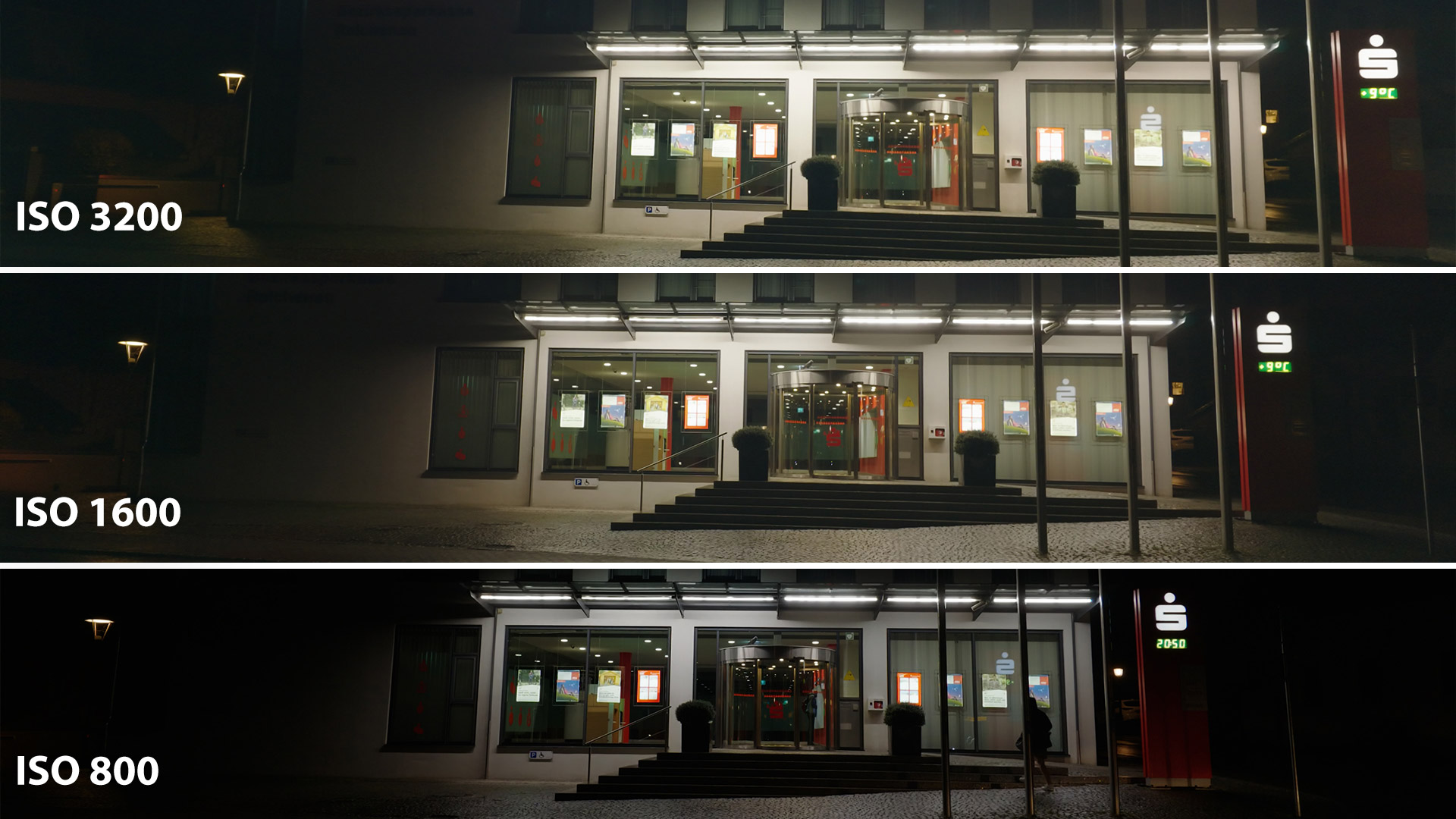 Mit ISO 800 sieht das Bild noch nahezu perfekt aus, bei ISO 1600 sieht man im Kopfsteinpflaster bereits erste Detailverluste und bei ISO 3200 kommt noch ein Bildrauschen hinzu.