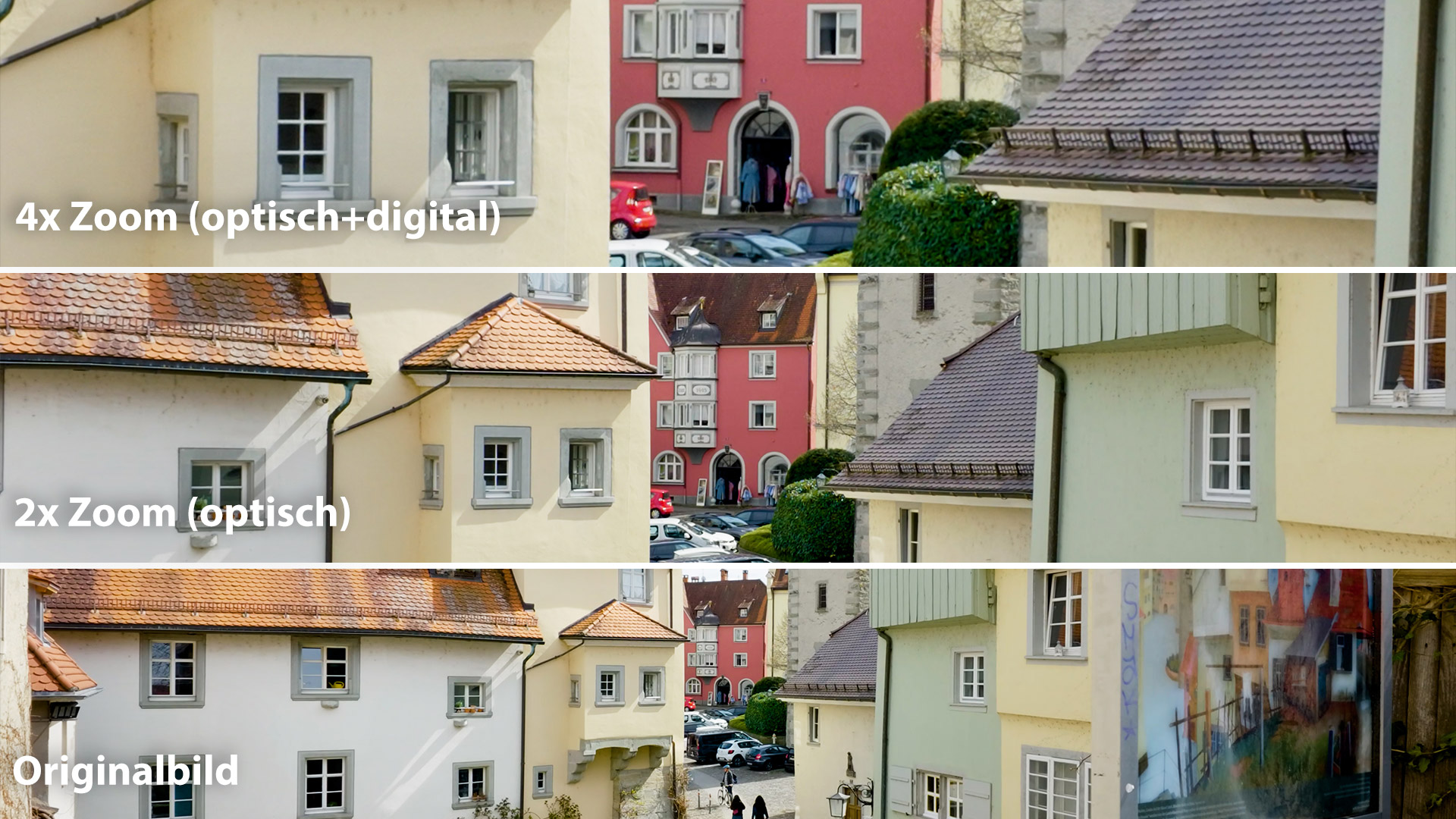 Das Original und das 2-fach-Zoom sind qualitativ identisch – das 4-fach-Zoom verursacht zumindest bei 4K-Aufnahme eine deutlich schlechtere Qualität, da hier digital ins Bild gezoomt wird.