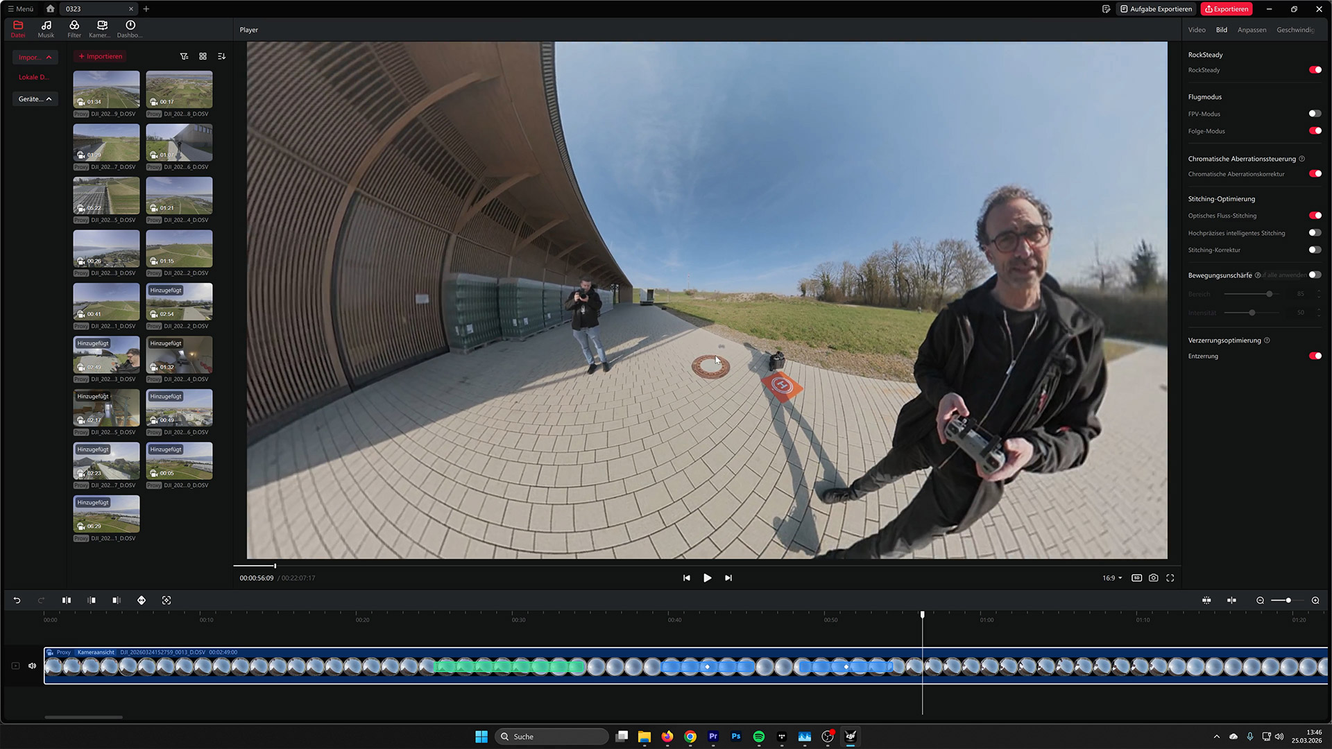 Da DJIs 360-Grad-Aufnahmeformat nach wie vor nicht von unserem Schnittprogramm Adobe Premiere Pro erkannt wird, mussten wir, um mit den Aufnahmen arbeiten zu können, den „Umweg“ über die Studio-Software gehen. Erfreulicherweise hat sich diese seit der Osmo 360 vor etwa einem Dreivierteljahr zu einer ernstzunehmenden Lösung entwickelt, die im Test nicht nur absturz- und bugfrei funktioniert hat, sondern auch mit mehr Features wie beispielsweise unterschiedlichen Stitching-Optionen aufwarten kann. Uns gefällt aber vor allem die Möglichkeit, alle in der Timeline befindlichen und gegebenenfalls bearbeiteten Clips als Gruppe einzeln zu exportieren. DJI Studio legt diese dann in einem Ordner gesammelt am Speicherort ab.