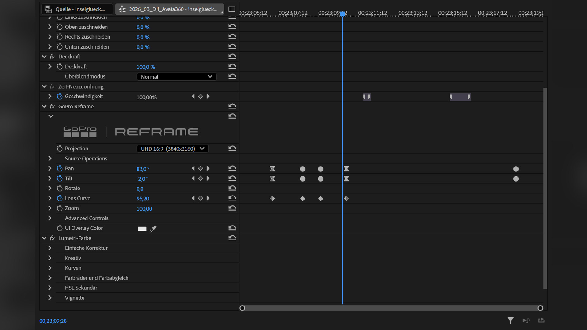Die zweite gute Nachricht: Die harte Kante, die bei der Osmo 360 immer dann aufgetreten ist, wenn man die exportierten Panorama-Aufnahmen mit den ensprechenden Plugins von Insta360 oder Adobe reframen will, ist weg. So konnten wir die 8K-Aufnahmen gleich entspannt als Panorama aus DJI Studio exportieren und anschließend mit beiden Plugins je nach bedarf reframen und gegebenenfalls animieren – so zum Beispiel geschehen mit der Aufnahme im Hotelzimmer. Dass man nicht mehr bereits fertig bearbeitete animierte Aufnahmen verwenden muss, erleichtert den Workflow ungemein. Ein eigenes Reframe-Plugin würde DJI dennoch gut stehen, denn natürlich sind die Lösungen von GoPro und Insta360 nicht auf den Gebrauch mit DJI-Kameras ausgelegt, beispielsweise was die Linsenkorrektur angeht.