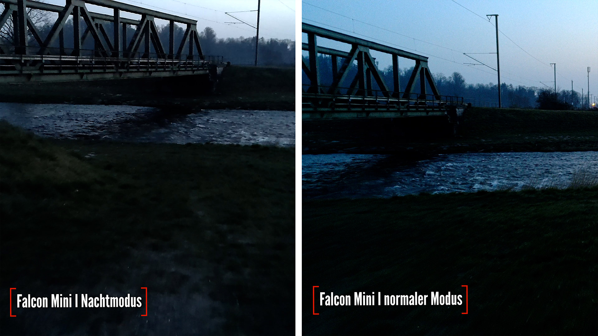 Der Vergleich zeigt, wie sehr die Detailschärfe im Nachtmodus abnimmt. Deutlich wird das vor allem an der Eisenbahnbrücke und an den Wellen im Fluss.