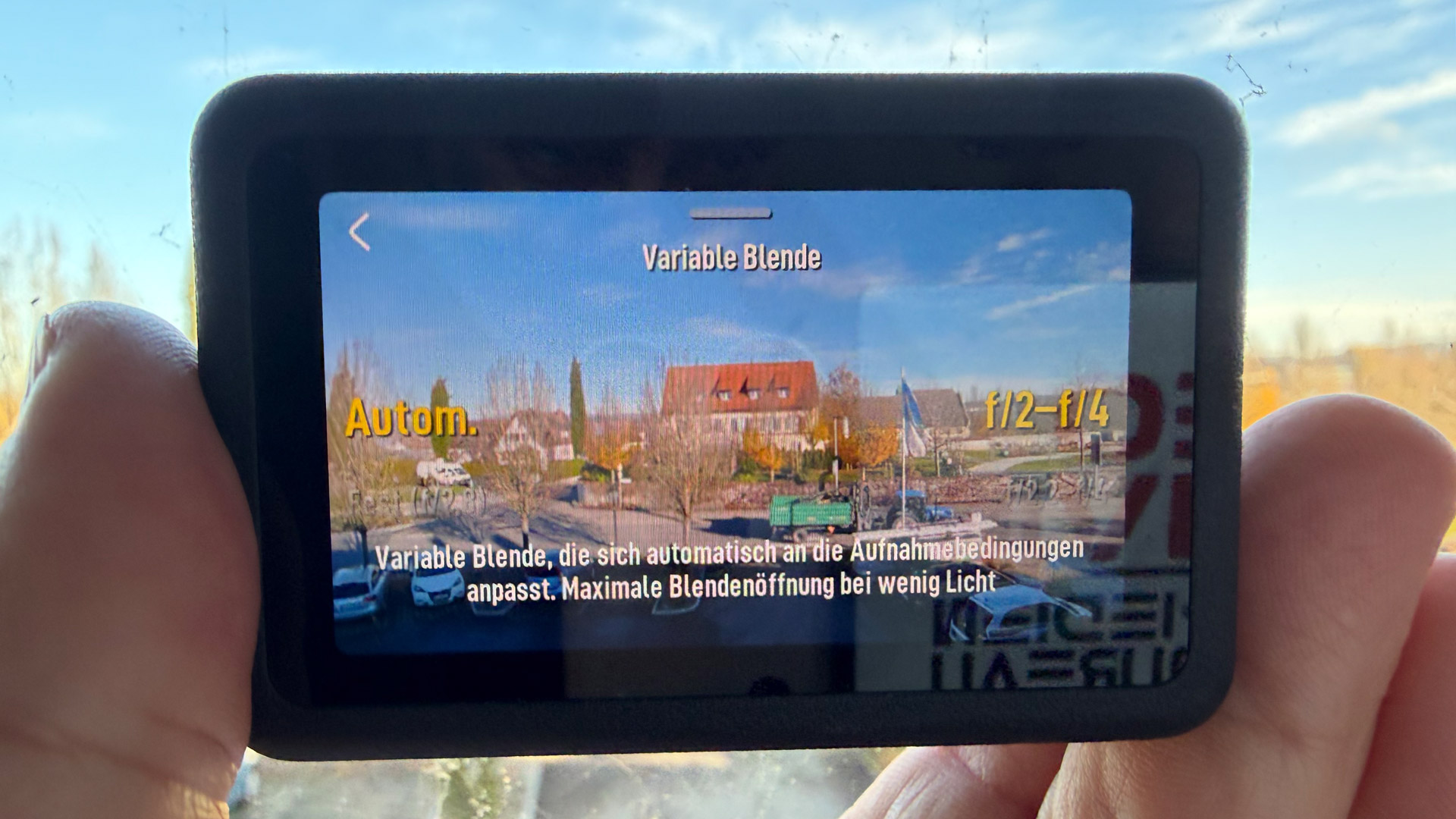 Im Automatikmodus kann die Osmo Action zwischen F2.0 und F4.0 variieren, doch manuell bietet die Actioncam derzeit nur F2.6, F2.8 und F4.0 an.