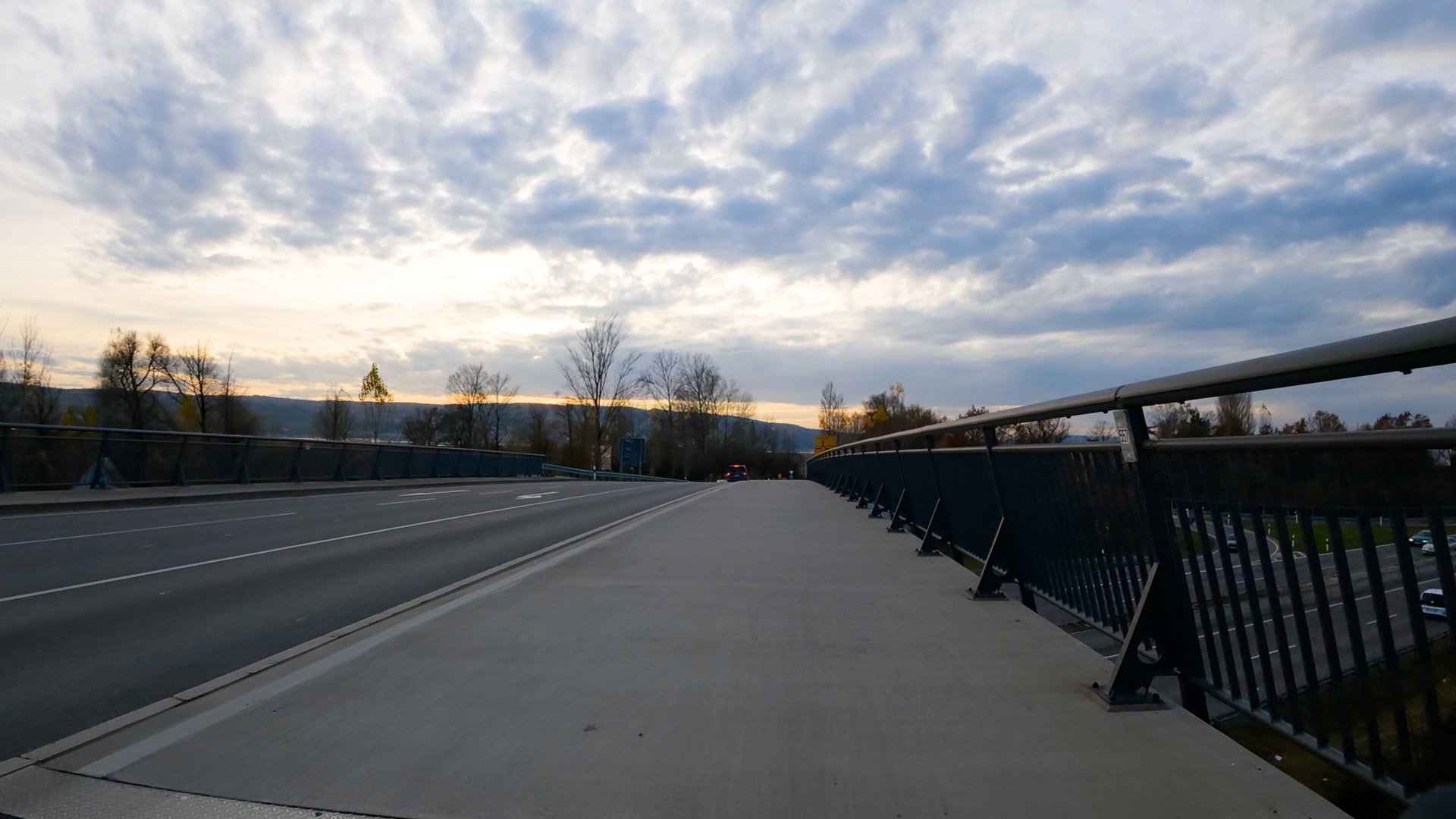 Das Bild zeigt eine sehr guten Dynamikbereich und hat in den weißen Wolken eine feine Zeichnung als auch in dunklen Bereichen noch genug Bildinformationen. Die schnell vorbeirauschenden Linien des Geländers wirken schärfer als bei der Konkurrenz.
