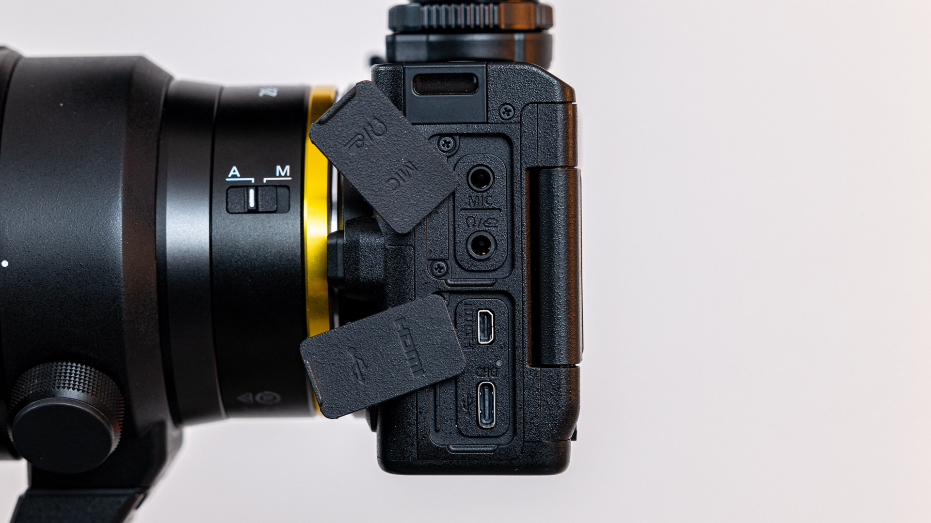 Mit TRS-Buchsen für Kopfhörer und Mikrofon sowie USB-C und HDMI-Eingängen sind alle erwartbaren Anschlüsse an Bord. Letzterer ist leider im kleinen, anfälligeren Micro-Format gehalten. Sollte man die Kamera in ein Rig einbauen, raten wir deshalb zu einer Zugentlastung respektive Kabelklemme, um den Anschluss zu schonen. Der USB-C-Anschluss dient nicht nur der Verbindung mit dem Rechner sowie dem Laden des Akkus, sondern ermöglicht auch die Aufzeichnung auf eine externe Festplatte. Parallele Aufzeichnung auf CFexpress-Karte und externe Festplatte ist (zumindest derzeit) nicht möglich, was aber unabhängig vom Hersteller noch keine Kamera in diesem Segment hinbekommt. Der Haken bei Nikon: Man muss erstmal die USB-C Schnittstelle für Festplatten rüsten, denn derzeit unterstützt die Nikon ZR diese noch gar nicht. Ob die Funktion via Firmware-Update kommt, ist derzeit unbekannt. [Anmerkung der Redaktion: Den Passus haben wir geändert, weil und hier und im Video leider ein Fehler unterlaufen ist]