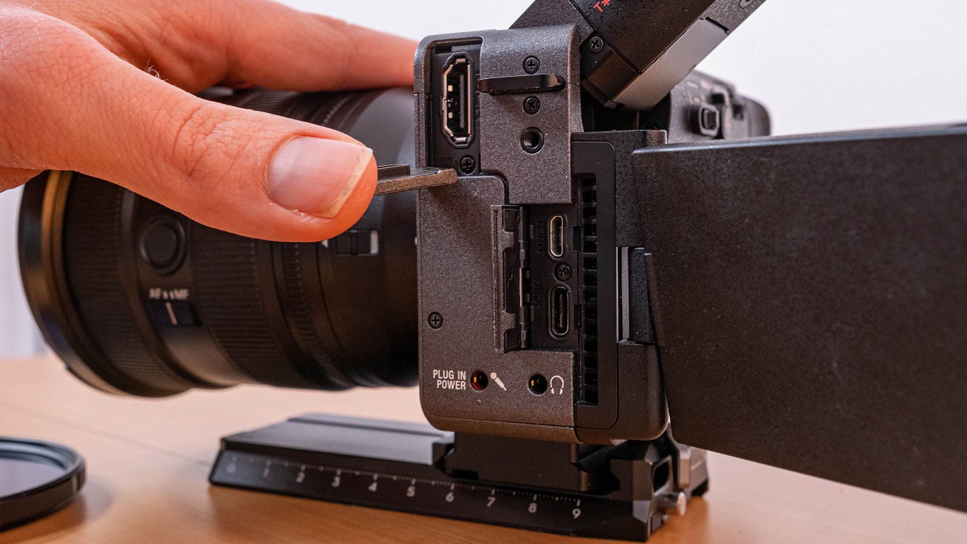 Ohne den Handgriff besitzt die FX2 die klassischen TRS-Buchsen für Kopfhörer und Mikrofon, wobei letzterer 48V-Phantomspeisung liefern kann und damit beispielsweise bei kompatiblen Funkstrecken ein automatisches Ein- und Ausschalten übernimmt. Anschlussseitig auffällig ist die eigentlich antiquierte Micro-USB-Buchse, die allerdings den Anschluss der Timecode- und Ethernet-Adapterkabel des Herstellers ermöglicht. Mit USB-C und „ausgewachsenem“ HDMI sind die anderen Anschlüsse soweit bekannt und einer kompakten Cine-Kamera würdig.