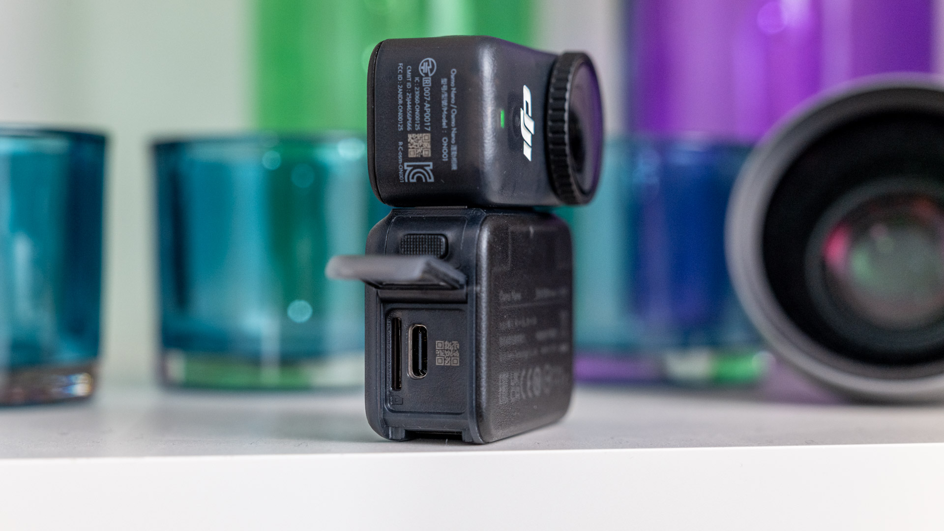 Ein großer Unterschied zur konkurrierenden Insta360 Go Ultra: Die Osmo Nano gibt es wahlweise mit 64 oder 128 GB integriertem Speicher. Dennoch hat DJI in der Monitor-Einheit ein Micro-SD-Kartenslot integriert, wobei dieser nicht direkt zum Speichern, sondern zum verschieben von Videodateien gedacht ist, was aus dem Menü in einem Rutsch klappt, wenn die Micro-SD-Karte groß genug ist. Man kann aber auch auf den Schritt verzichten, wenn man die Kamera direkt mit der daneben befindlichen USB-C-Schnittstelle mit dem Rechner verbindet, denn dann lassen sich die Videos ins Dateisystem kopieren.