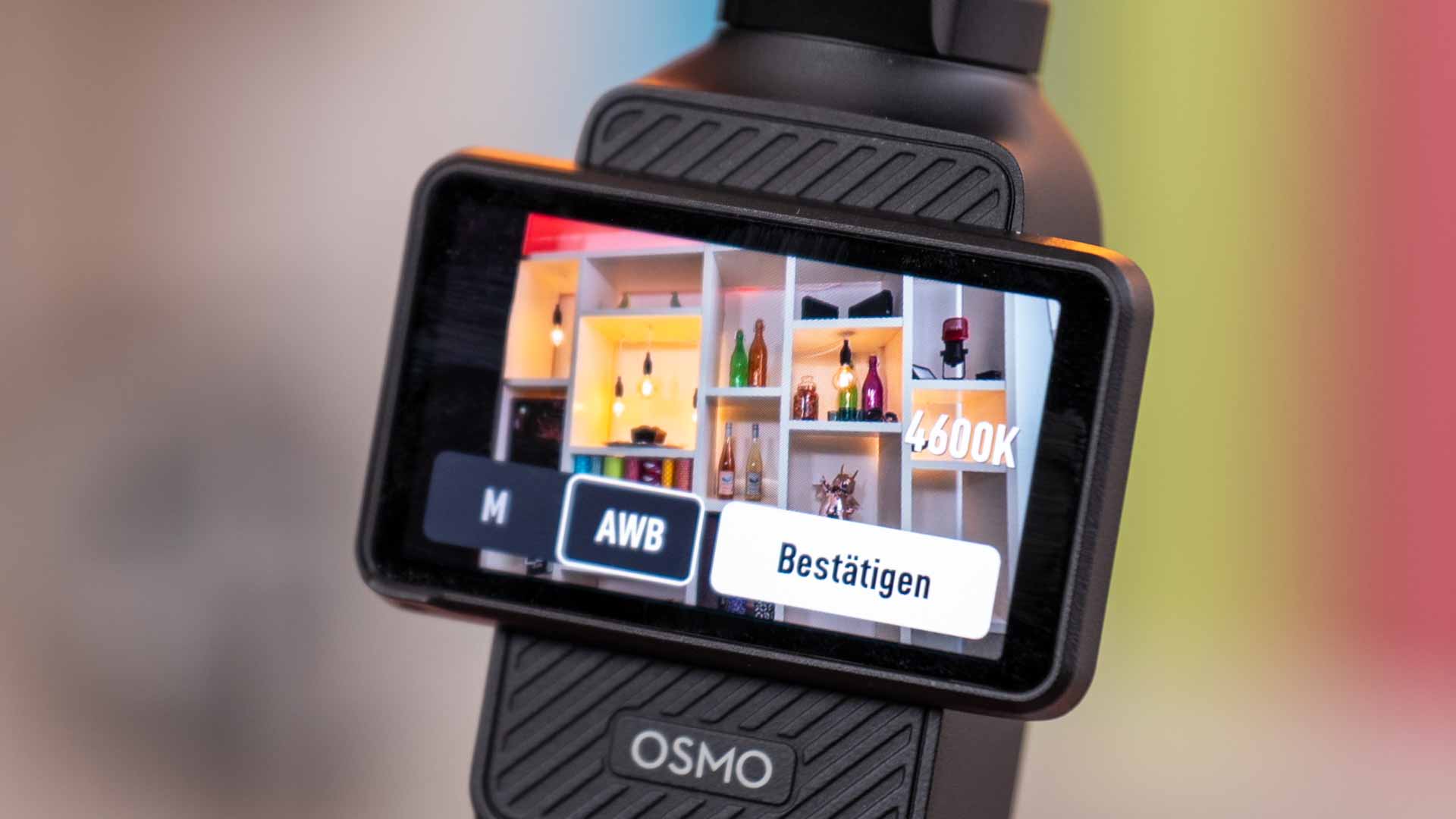 Wobei die kleine Osmo Pocket 3 eben nun auch mit einem Dreh am 2-Zoll-großen Display einschaltet, und wenn man es im Menü angewählt hat, nicht nur die Kamera auf dem Gimbal ausrichtet, sondern gleich in den Aufnahmemodus geht. Das nun deutlich größere Display ist dennoch immer noch nicht groß, lässt nun aber zumindest halbwegs die Bildbeurteilung zu. Größer ist der Fortschritt im Menü, das sich nun deutlich komfortabler bedienen lässt. Dennoch muss man recht genau mit dem Finger auf dem Touchscreen zielen, um den richtigen Menüpunkt auszuwählen. Dass dies hier nicht immer klappt ist lästig, aber nicht schlimm. Deutlich unangenehmer ist das, wenn man zum Beispiel das Gimbal mit dem kleinen Symbol im unteren rechten Eck des Bildschirms in den Selfie-Modus drehen lassen will, stattdessen hier aber den Schärfepunkt hin verlagert. Mit einem Wisch von links nach rechts kommt man in die Bildeinstellungen, wo Kameraleute nun das flache D-Log M-Profil mit 10-Bit-Farbtiefe auswählen können. Aufgezeichnet wird so maximal in UHD-Auflösung mit 30 Bildern in der Sekunde. Erst nach dem Wechsel in den Normalmodus, stehen dann sind bis zu 60 Bildern in der Sekunde zur Verfügung.