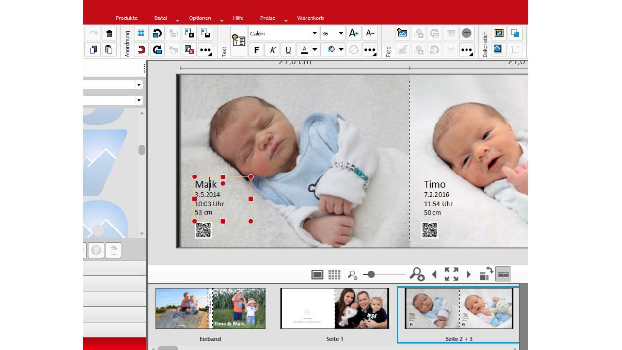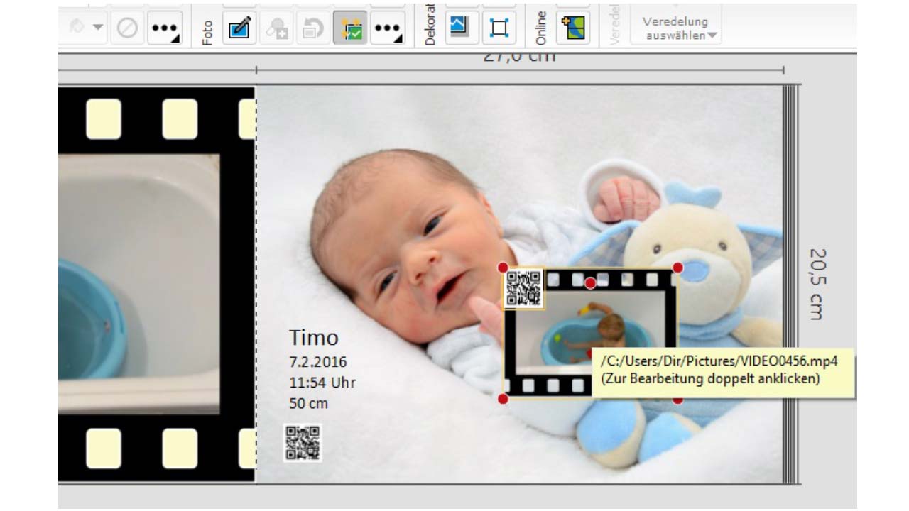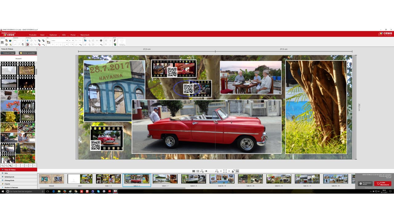 Es gibt die Option einen Filmstreifen mit Bildern aus dem Video zu erstellen. Die Anzahl der Bilder ist dabei frei wählbar. Ich habe mich für vier Bilder entschieden. Das sieht meiner Meinung nach noch übersichtlich und gut aus. Die Möglichkeit, Videos in ein Fotobuch einzubinden, kannte ich bislang noch nicht und ich bin wirklich begeistert von dieser Idee und der Technik, die dahinter steckt. Es wird für jedes eingebundene Video ein QR-Code generiert, der dann mit jedem Smartphone und entsprechendem QR-Code-Scanner (eine kostenlose App) ausgelesen werden kann. Einfach genial. Ein bisschen schade ist allerdings, dass pro Video nur eine Länge von bis zu 5 Minuten möglich und die Speicherzeit begrenzt ist.