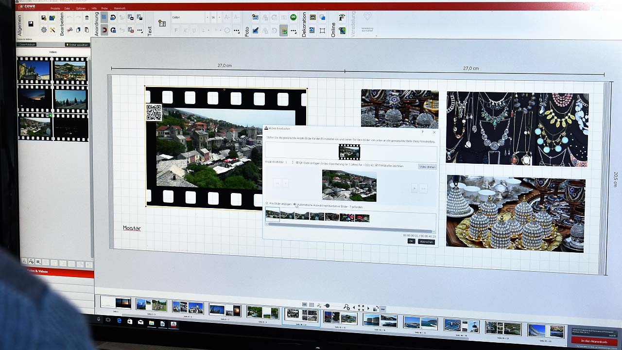 Spätestens mit der 4K-Auflösung sind Videobilder problemlos druckbar – auch in einem hochwertigen Fotobuch. Ob es nun das Buch zum Urlaub oder aber die Bilder vom „Making-of“ des letzten großen Filmprojekts sind – Einzelbilder bleiben für Filmer nur die halbe Miete. Irgendwie will man ja eigentlich die Anbindung ans filmerische Werk hinbekommen. Genau diese Funktion liefert Cewe, denn mit der Fotobuch-Software lässt sich ein Video verarbeiten und schick präsentieren. Die Software holt sich einzelne Bilder heraus und integriert diese zusammen mit einem QR-Code in einen Filmstreifen, wobei man noch individuell festlegen kann, wieviele und welche Bilder im Filmstreifen angezeigt werden sollen. Damit hat man schon mal Einzelbilder ohne besonderen Aufwand integriert.Spannender ist jedoch, dass man mit der Übermittlung des Fotobuchs auch automatisch den Film zu Cewe überträgt. Der Leser des Buchs kann nun mit einem Smartphone oder Tablet den QR-Code scannen und bekommt somit sofort den Film zu sehen.