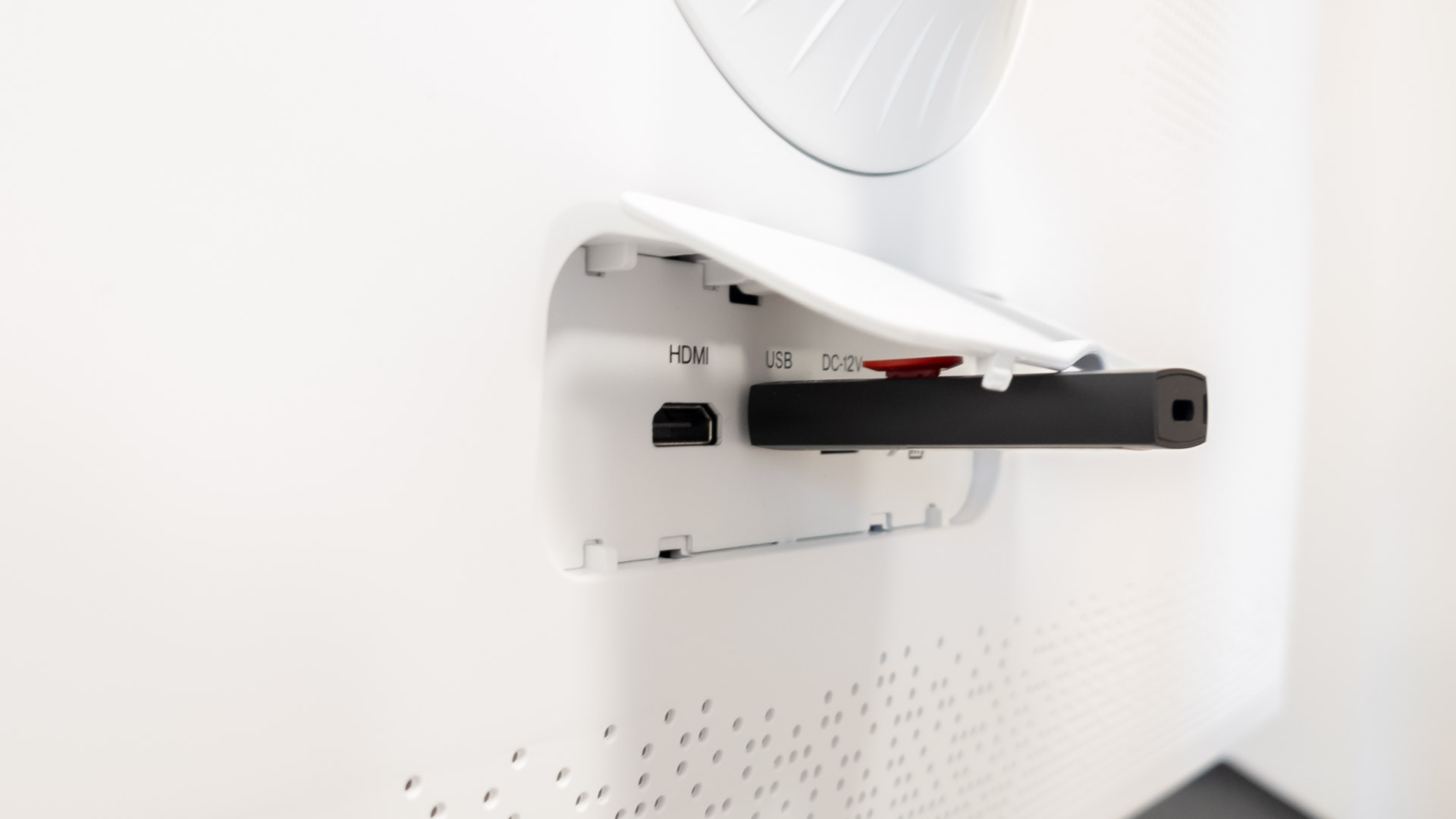 Natürlich kann man den Smart-Bildschirm auch wie ein PC-Monitor via HDMI mit einem Signal versorgen, wobei er immer Full-HD (1920 x 1080 Pixel) Auflösung bietet. Steht man dicht vor dem Monitor, fällt schon deutlich auf, dass die Auflösung nicht auf Top-Niveau liegt. Aber so dicht steht man nur bei der Eingabe vor dem Monitor – schon bei normalem Betrachtungsabstand passt die Full-HD-Auflösung. Die Helligkeit reicht mit 300 Candela für unser Studio und auch den tageslichthellen Besprechungsraum gut aus. Allerdings ist das Display nicht wirklich kontrastreich. So brennen im Video helle Stellen deutlich schneller aus, als sie das auf guten Displays tun. In dunklen Bereichen sieht es etwas besser aus – aber auch hier dürfte das Display etwas mehr leisten. Die nach hinten abstrahlenden Stereo-Lautsprecher haben eine Leistung von 10 Watt und reichen für Kleinigkeiten aus. Mal eben ein Video anspielen ist in Ordnung, einen Film mit ordentlichem Klang genießt man so eher nicht. Dazu müsste man dann nachrüsten, was über die USB-A- und USB-C-Anschlüsse mit externen Boxen funktioniert, auch wenn diese eigentlich für die Datenübertragung gedacht sind.