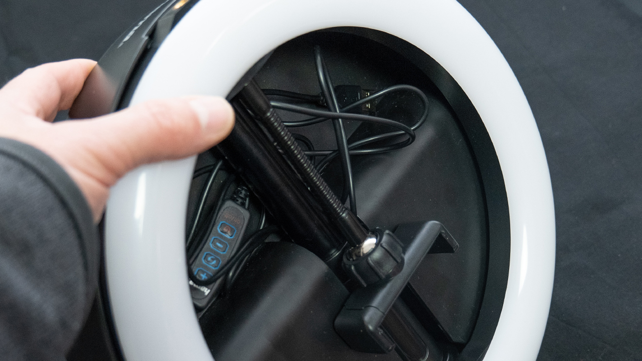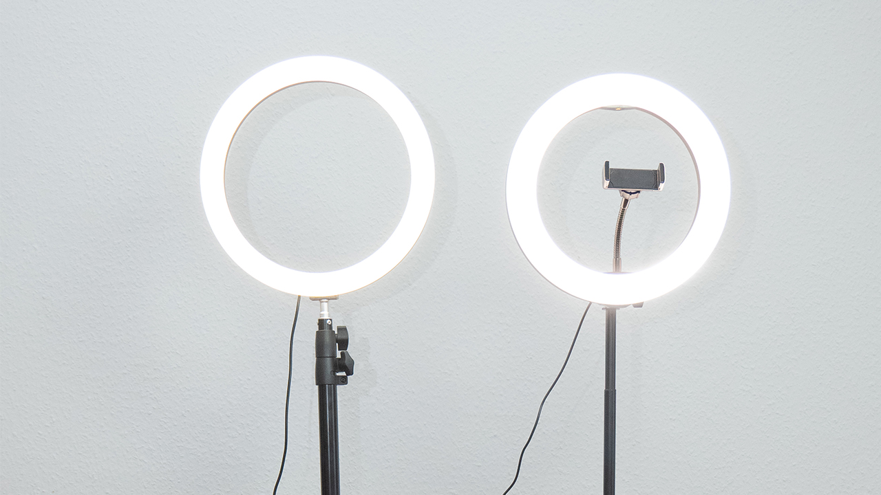 Bei größerem Umfang ist der leuchtende Ring der teureren Variante etwas schlanker. Das mitgelieferte Stativ ist robuster als die integrierte Teleskopstange des günstigeren Modells.
