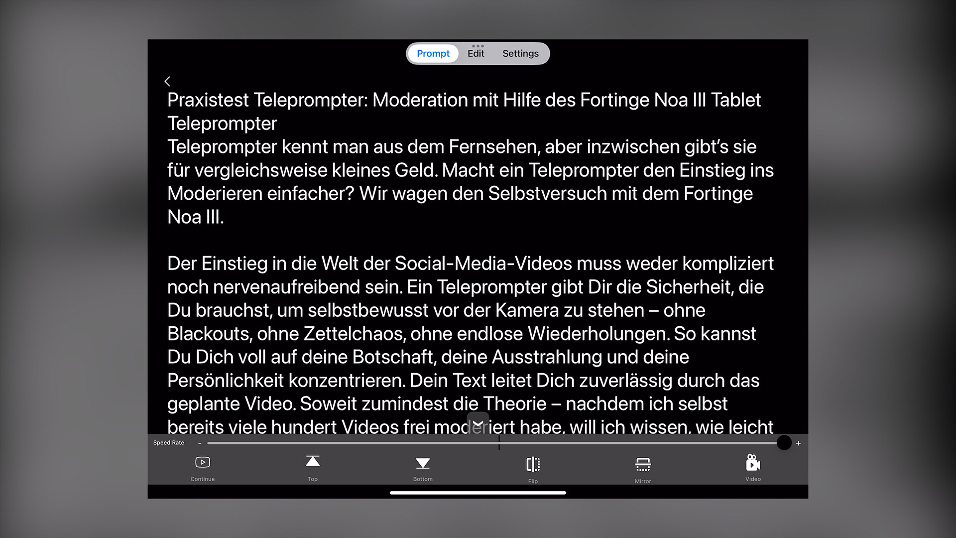 Wenn man nun in der App auf den Menüpunkt Pormpt geht, lässt sich der Text zum einen für den Teleprompter spiegeln und dann abspielen. Damit der Text nicht direkt loslegt, kann man einen Countdown vorschalten. Auch die Scroll-Geschwindigkeit lässt sich vorgeben, doch man passt einfacher mit Hilfe der Fernbedienung an. So lässt sich durchaus mal das Tempo anziehen oder runterbremsen. Entscheidend ist, dass der Text nicht erst dann ins Bild kommt, wenn man ihn benötigt und zu schnell oben aus dem Bild rutscht. Beides verursacht Unsicherheit doch hat man sich einmal an die Fernbedienung gewöhnt, kennt diese genug Geschwindigkeitsstufen, um sauber durch die vorgegebene Moderation zu kommen.