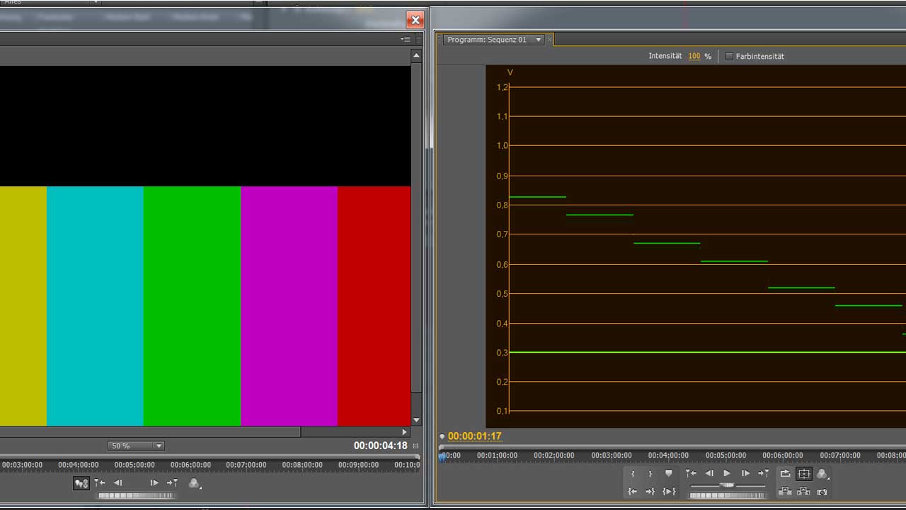 Der Schwarzbalken im Testbild erzeugt einen Spannungspegel von 0,3 Volt – hier dargestellt an den Bildkontroll-Instrumenten von Premiere.