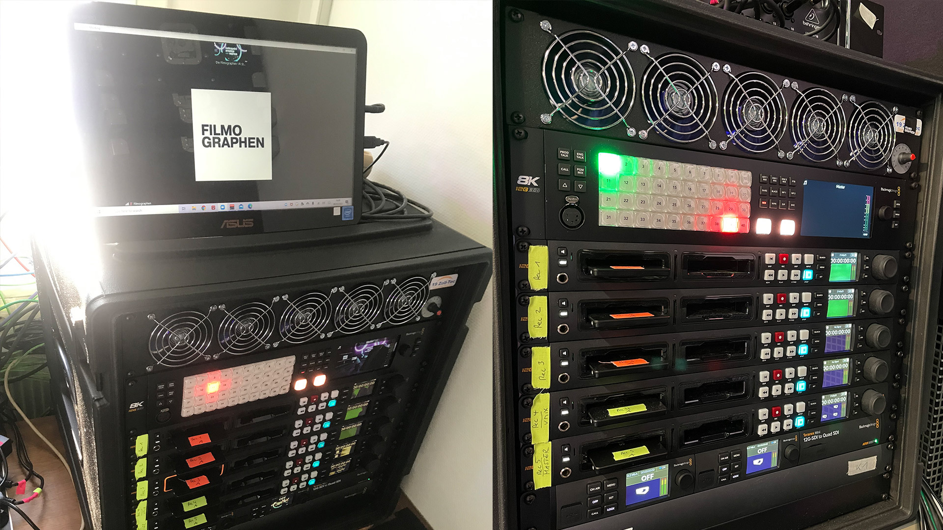 Die Hyperdecks können alle Signale unabhängig voneinander aufzeichnen, womit nachträgliche Korrekturen auch nach einer Session im Studio möglich sind. Sie sind verbaut in einem mobilen Rack, zusammen mit den beiden Ultimatte-Keyern und dem Herz der Signalverarbeitung, dem Blackmagic Atem Constellation 8K und zwei PC-Rechnern, auf denen die 3D-Software bzw. V-Mix läuft.