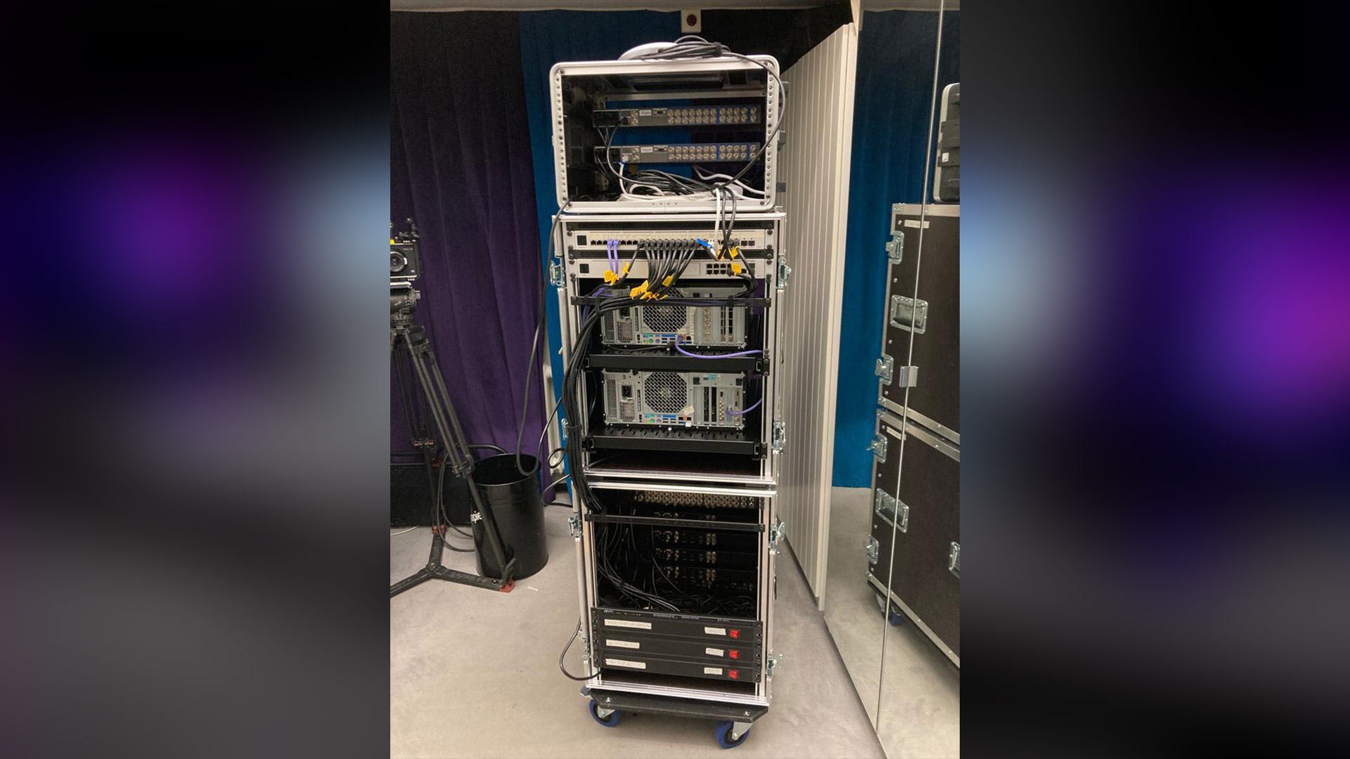 Das Rack mit (v.o.n.u.) mit zwei Ultimatte-Keyer, Steckfeld mit Funkton-Empfängern, zwei zertifizierte Rechner, der Atem Contellation 8K und fünf Hyperdecks.