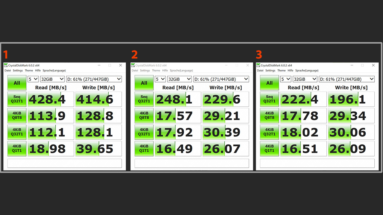 Unsere SanDisk Portable SSD haben wir direkt am Thunderbolt-3-Anschluss gemessen und dabei die höchte Datenrate (Bild 1) erreicht. Mit einem am Thunderbolt 3 hängenden Dock sinkt die Datenrate (2. Bild) unter anderem natürlich auch deshalb, weil hier nur noch USB 3.1 verfügbar ist. Da auch hier nicht genug Schnittstellen vorhanden sind, hängt nochmal ein USB-Hub an der Docking-Station, die dann die Datenrate nochmal leicht nach unten drückt (Bild 3).