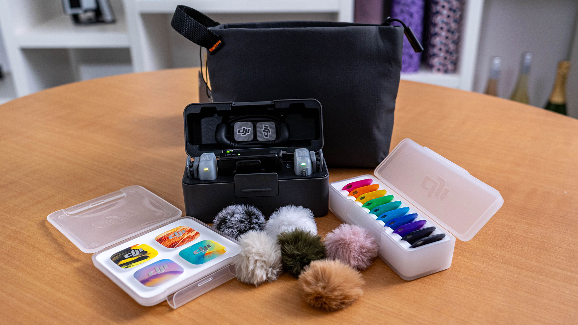Farbige Abdeckungen sind auch bei Profis gerne gesehen, um beispielsweise die Funkstrecken-Farbe an die Kleidung der tragenden Person anzupassen. Schade allerdings, dass auf allen Abdeckungen groß das DJI-Logo prangt und die grauen Sender so nicht wirklich diskret sind. Diese sitzen wie gewohnt zusammen mit dem Sender in der Ladeschale, die nun neben den Smartphone-Adaptern auch noch Magnete und das TRS-Kabel aufnimmt. Letzteres braucht etwas Übung, um es in die entsprechenden Aussparungen hineinzubekommen. Hat man sich daran gewöhnt ist es aber praktisch, alle Komponenten schon in der Ladeschale zu haben, wodurch man keinen zweiten Transportbeutel braucht. Diesen legt DJI aber trotzdem bei, falls man sich beispielsweise für weiteres Zubehör entscheidet. Die Tasche ist dabei groß genug, um beispielsweise den optionalen Sony-Multifunktionsschuhadapter oder weitere Kabel aufzunehmen.