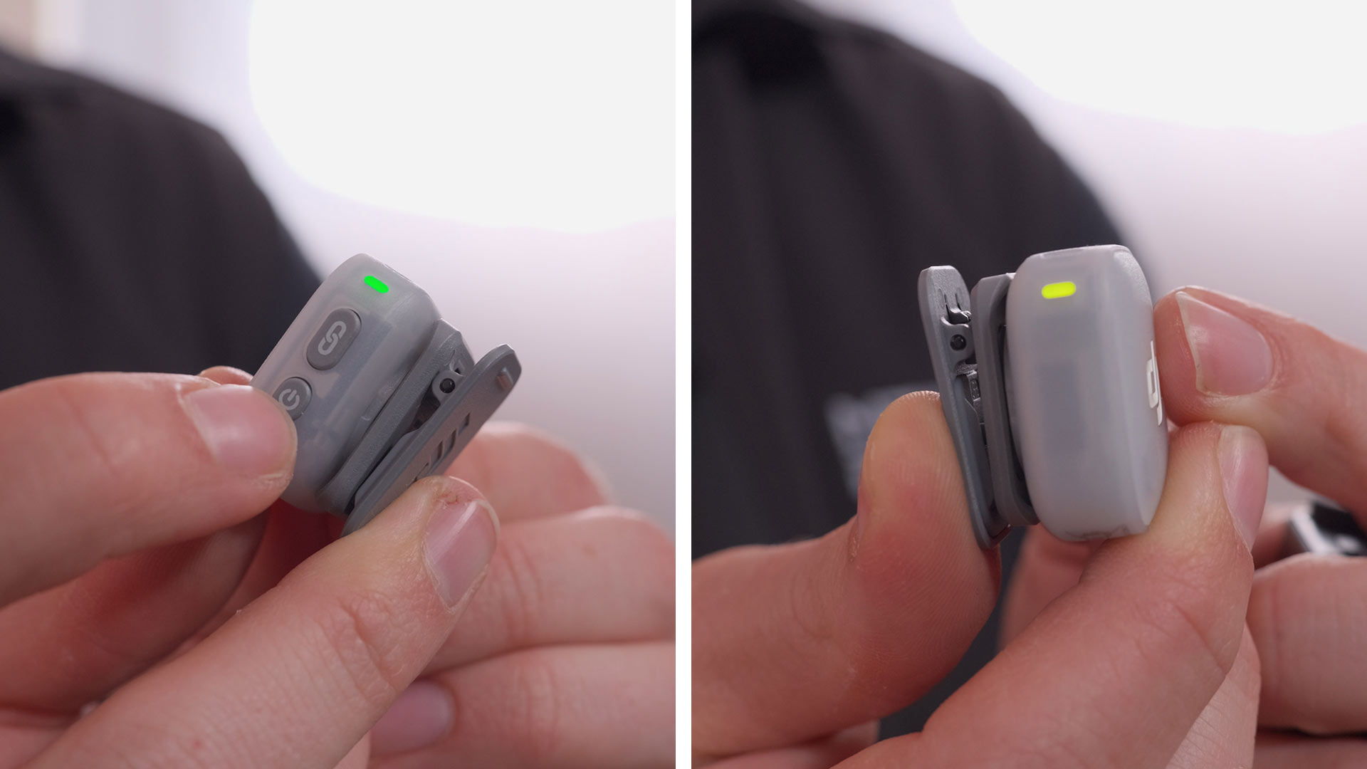 Drückt man die Anschalt-Taste doppelt, aktiviert man die Nebengeräusch-Reduzierung, was der Sender durch eine gelbe LED an Sender und Empfänger anzeigt.