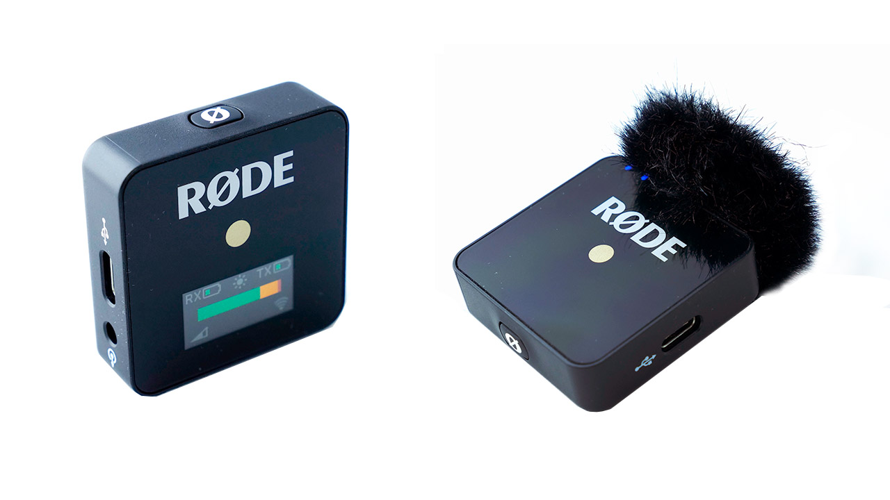 Links der Empfänger mit einem gut lesbaren Display, rechts der Sender mit eingebautem Mikrofon und Fellwindschutz.