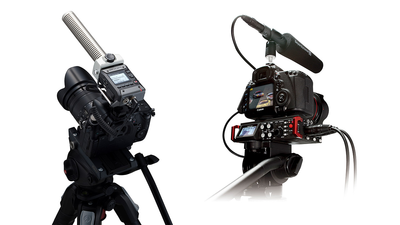 Kompakte Modelle wie der Zoom F1-SP passen auch oben auf eine Kamera. Hier ersetzt das Gerät ein Richtmikrofon samt Recorder. Manche Fieldrecorder wie hier der DR-70 D von Tascam erlauben alternativ auch die Montage zwischen Stativ und Kamera.