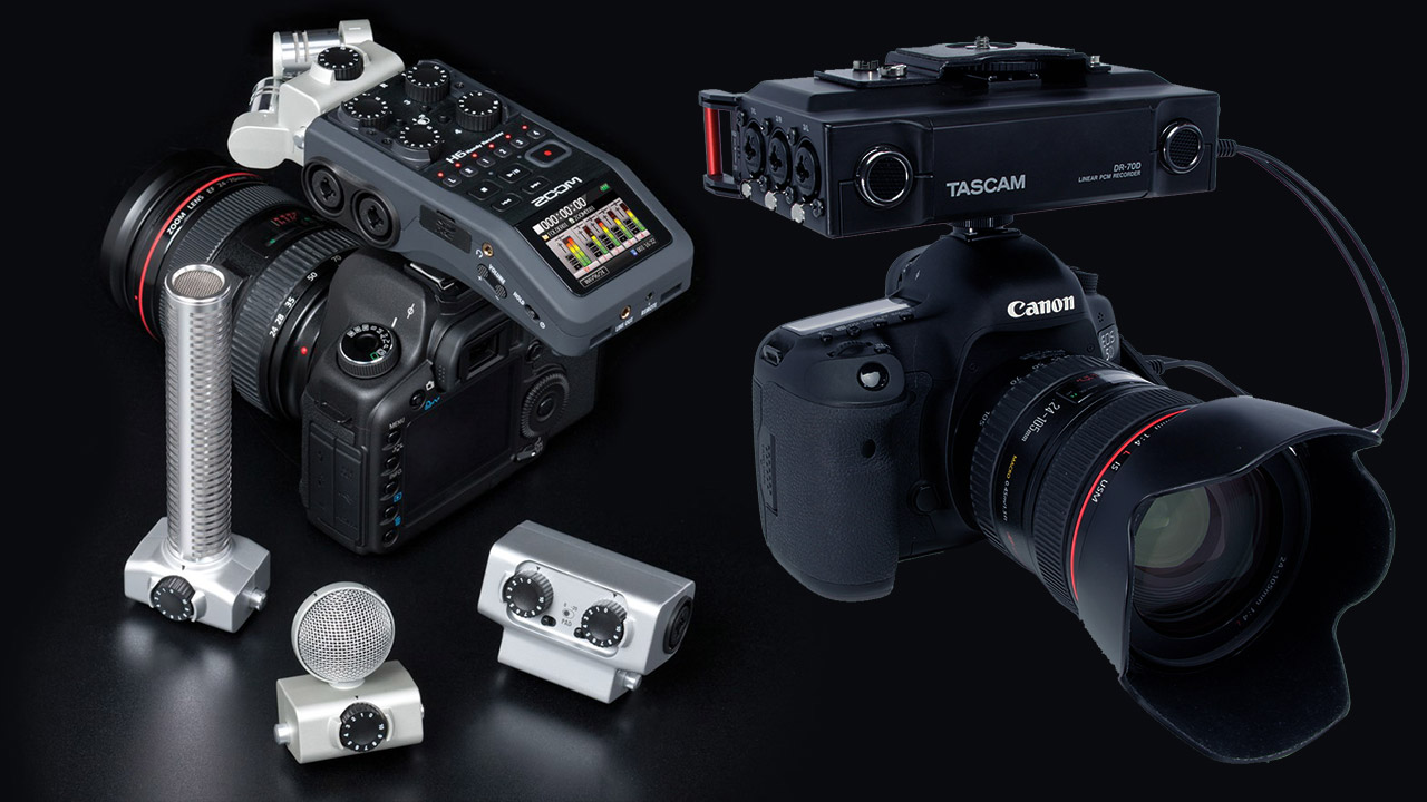 Unterscheidung schwierig: Ein DSLR-Fieldrecorder wie Tascams DR-701D (links) lässt sich genauso oben auf einer Kamera montieren wie Zooms Dauerbrenner H6. Beide Modelle bringen auch ähnliche Funktionen mit.