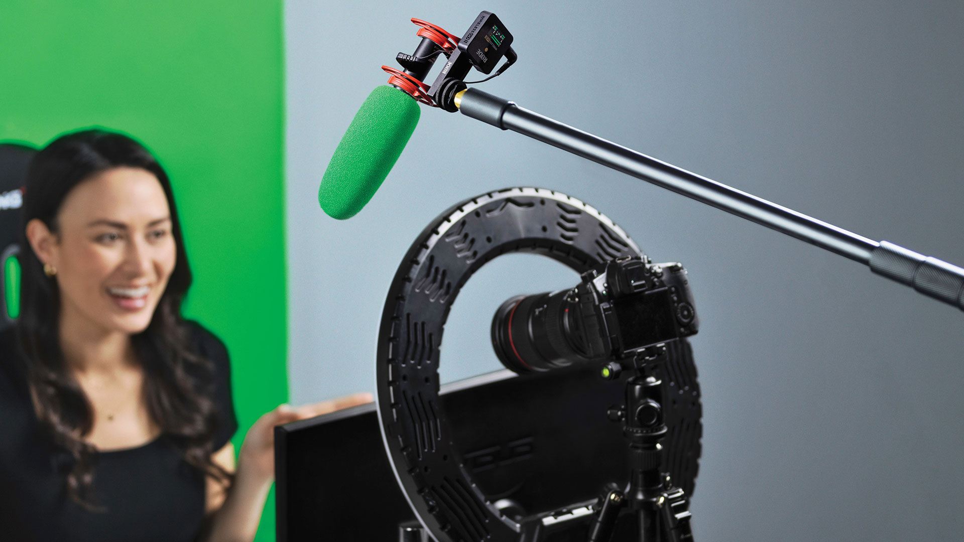 Keine Angst vorm Mikro im Bild: grüner Spezial- Windschutz für sichere Greensceen-Szenen.