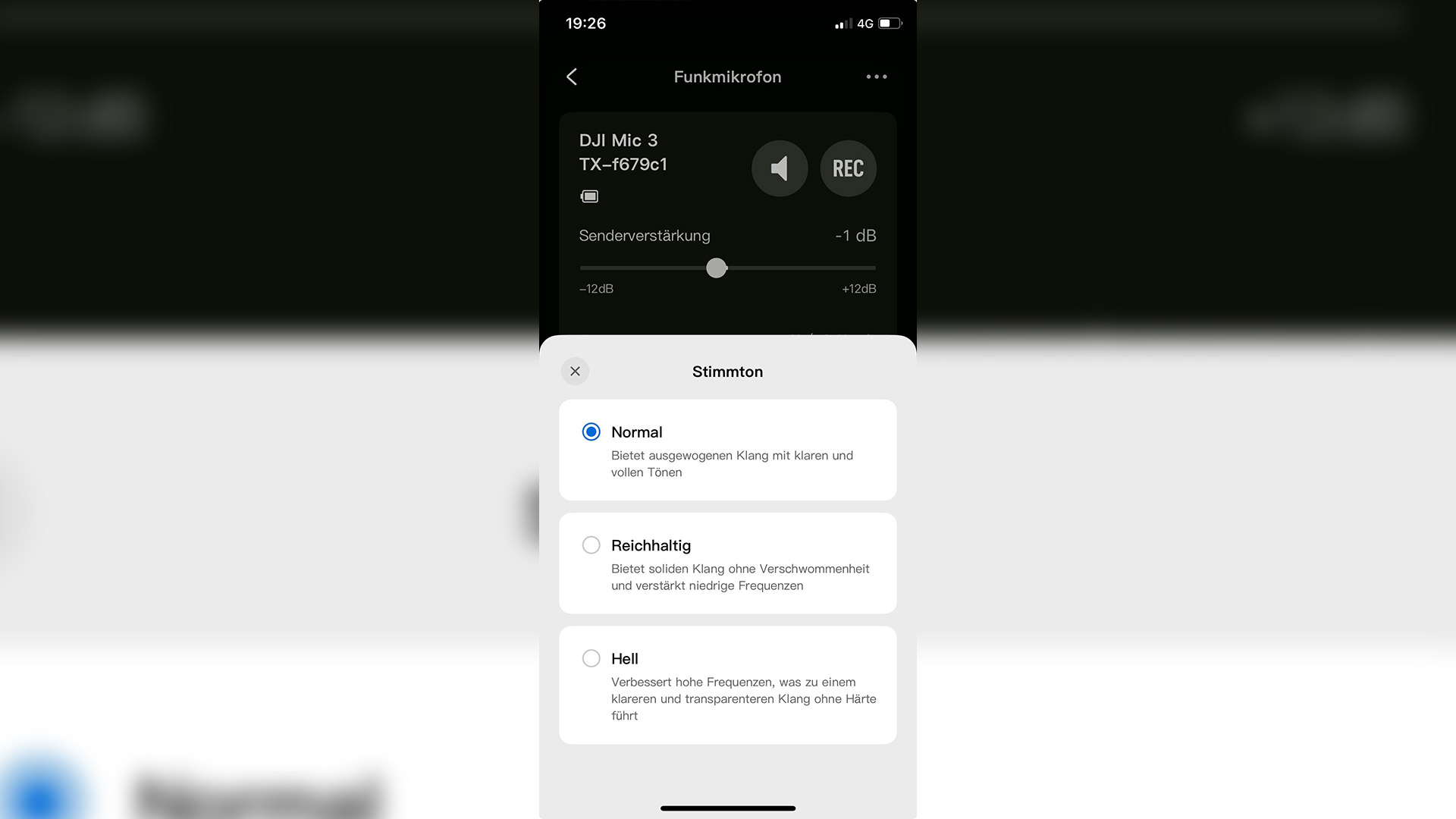 Als weitere Optionen bietet das Mic 3 eine adaptive oder dynamische Verstärkungsteuerung – auf gut Deutsch: Die Lautstärkeregelung übernimmt das Mikrofon – aus unserer Sicht ist das keine gute Option, denn besser ist es manuell auf ca -9 dB zu regeln und sich so den Puffer für Spitzen zu holen. Zudem bietet das Mikrofon die 32-Bit-Float Aufzeichnung, mit der man nachträglich den Pegel verlustfrei einstellen kann. Lediglich wer genau weiß, dass es beim anstehenden Dreh zu sehr extremen Lautstärkeausschlägen kommen kann, zum Beispiel vor den Boxen eines Rock-Konzerts, kann die die automatische Pegelung in Betracht ziehen – allerdings muss man davon ausgehen, dass in so extremen Situationen das Mikrofon an die Grenzen des Schalldruckpegels kommt und die Automatik auch nicht mehr viel retten kann. Ähnlich unnütz erscheint uns die Anpassung des „Stimmtons“: „Reichhaltig“ führt zu einer Überbetonung von Bässen und „Hell“ sorgt für ein zu dünnes Stimmchen.