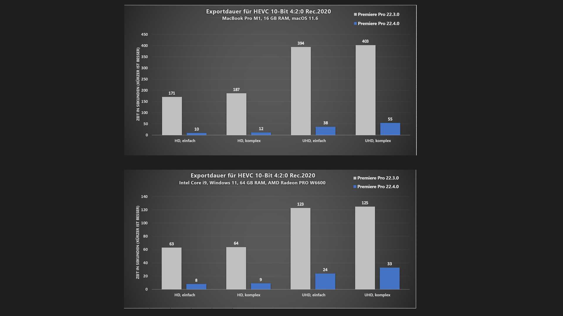 Adobe Premiere Pro 22.4 bringt ein schnelleres Encoding für HEVC-Material in 4:2:0 10 Bit jetzt auch auf AMD GPUs unter Windows sowie für Mac-Systeme mit Intel- und M1-CPU.