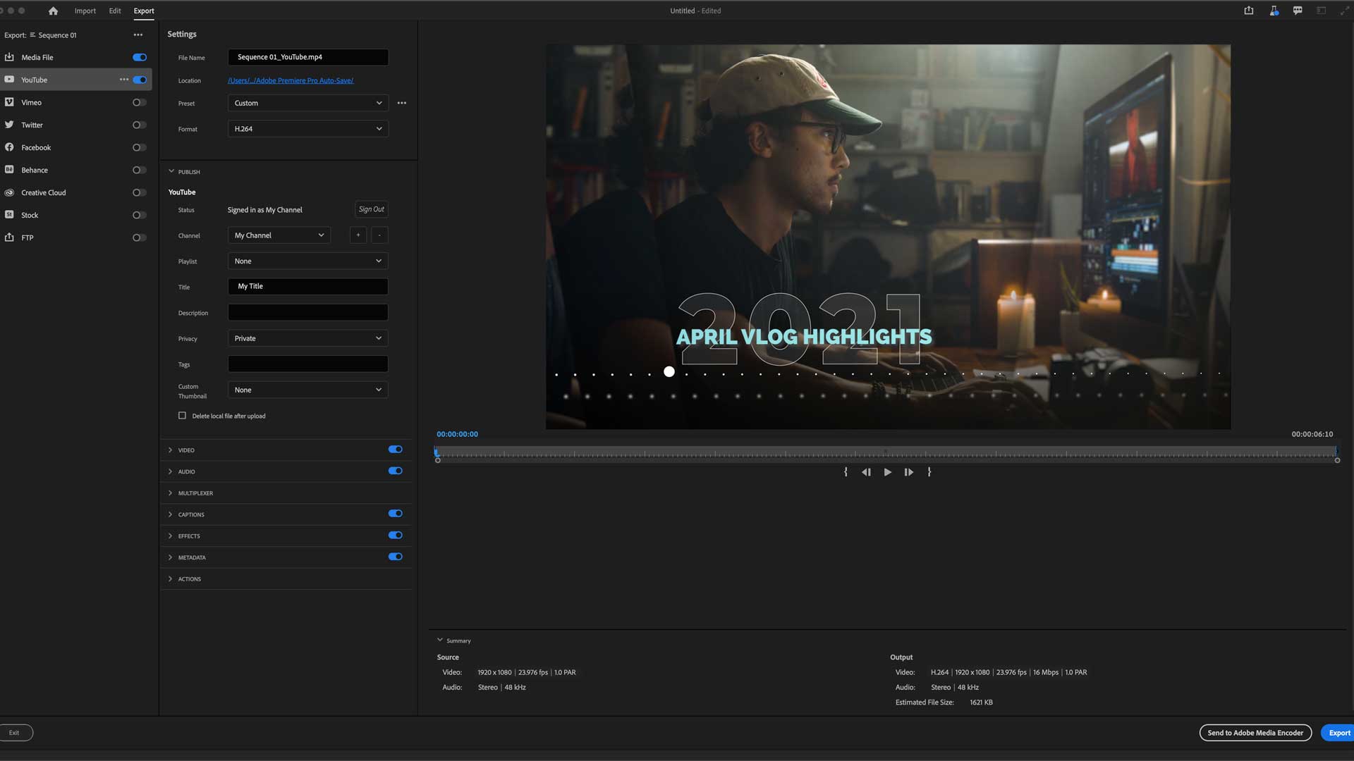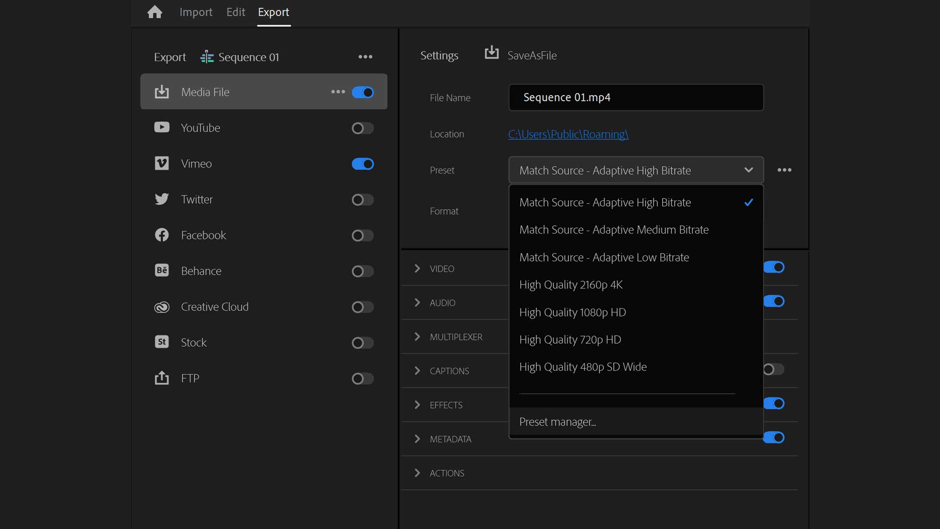 Apropos Export: Hier haben die Entwickler am meisten gemacht, denn sie gehen davon aus, dass die meisten mit den vielen Einstellungen überfordert sind. Entsprechend hat das neue Export-Fenster nun vorgefertigte Exporteinstellungen für YouTube, Vimeo, Twitter und Facebook. In diesen vorgefertigten Export-Profilen kann man bereits einstellen, wie das Video veröffentlicht werden soll. Zudem kann man gleich mehrere für verschiedenen Plattformen optimierte Videodateien berechnen lassen. Wer dennoch mehr einstellen will, kann sich auch in einem dahinter liegenden Preset-Manager austoben. Hier darf man auch eigene Profile anlegen und den Videoplattformen zuordnen. Insofern gibt es nun auch im Quick-Export die Möglichkeit die eigenen Einstellungen zu erreichen. Das neue Fenster soll den Media Encoder auf Dauer offensichtlich überflüssig machen, denn auch Funktionen wie das Einbinden von Effekten für den kompletten Export bietet das neue Export-Menü. Dennoch wird man auch weiterhin über den Media Encoder arbeiten können.