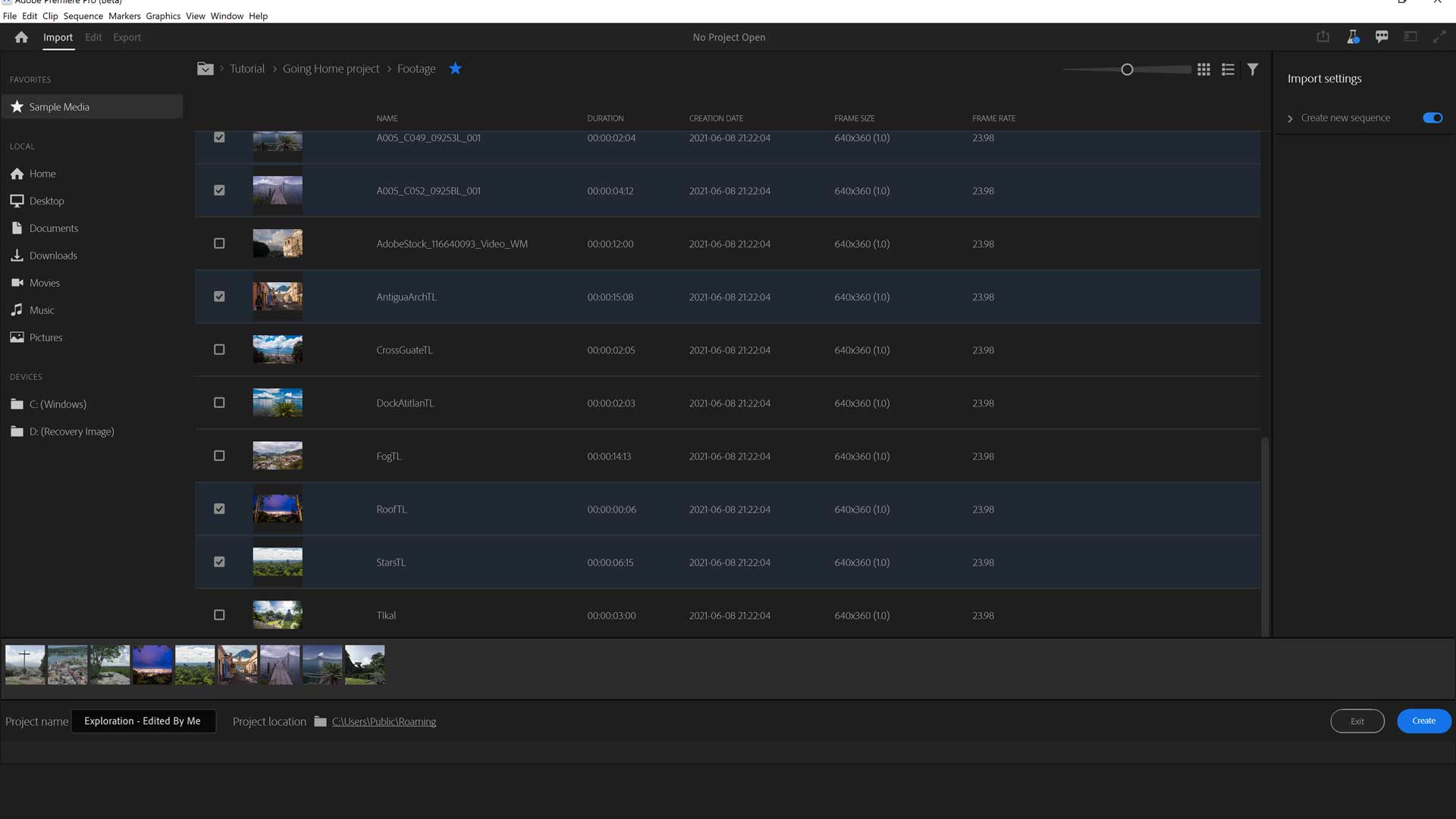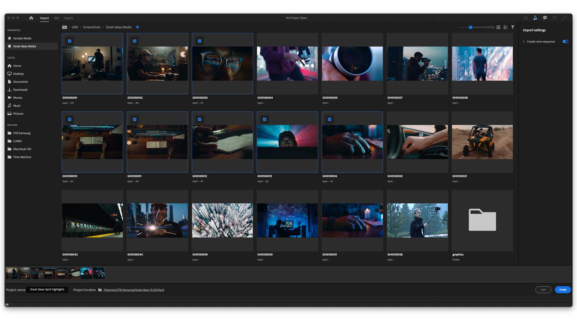 Die Beta-Phase der letzten Wochen hat es schon angedeutet: Neu ist der Import Mode, der den Adobe in der Public Beta bereits gezeigt hat. Schon beim Import gibt es ein neues Fenster mit dem man besser die Medien vorsortieren und gemeinsam ins Projekt importieren kann. Dabei darf man auch mehrere Medien aus verschiedenen Ordnern als Favoriten markieren und somit gemeinsam importieren. Ideal ist dies zum Beispiel, wenn man Material aus verschiedenen Projekten für einen Zusammenschnitt aussuchen und direkt in eine gemeinsame Timeline legen möchte. Über das gleiche Importfenster kann man aber auch jederzeit neues Material in ein vorhandenes Projekt importieren. Zudem hat Adobe die Menüzeile komplett überarbeitet und entschlackt.