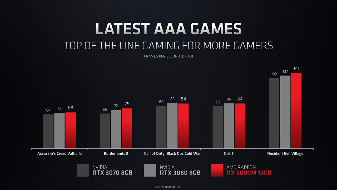 Laut eigener Performance-Tests von AMD soll die AMD Radeon RX 6800M in 1440p bei der Spiele-Performance der Nvidia RTX 3080 Laptop GPU ebenbürtig sein.
