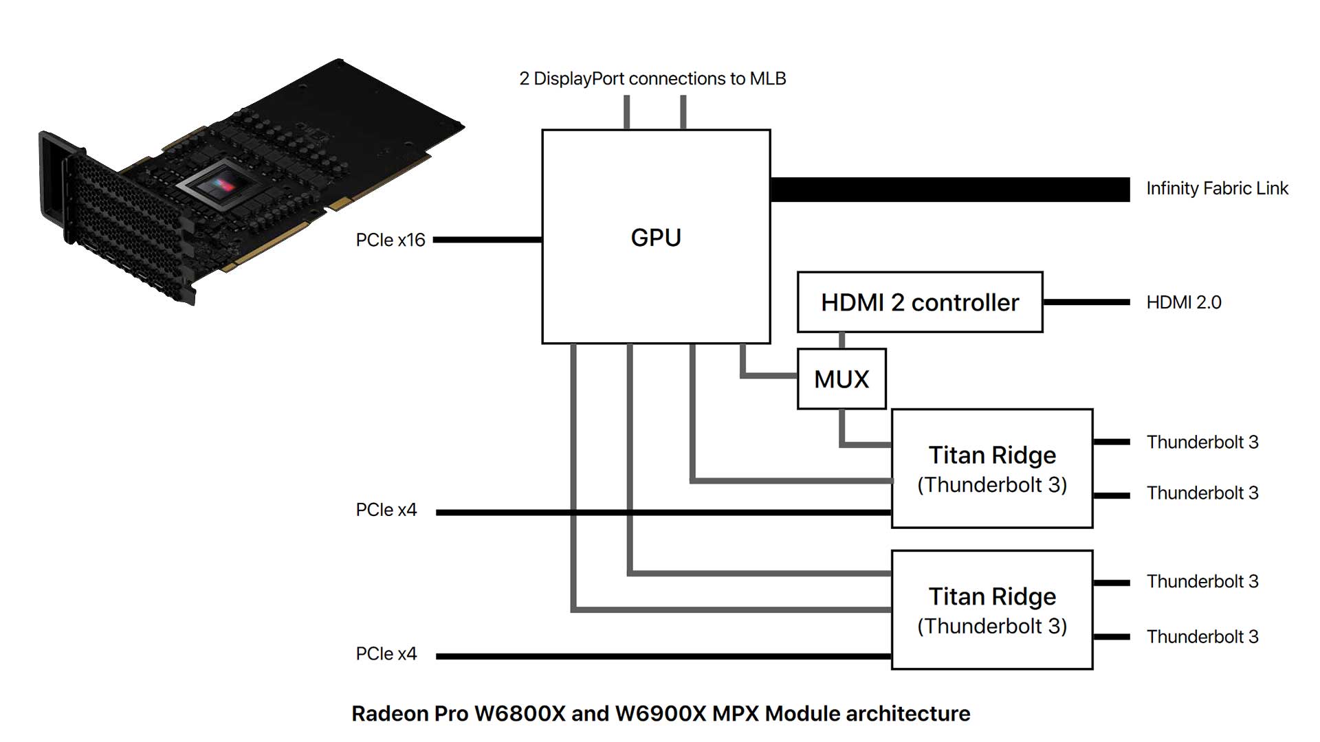 Das Flaggschiff stellt die Konfiguration mit einer Radeon Pro W6900X dar, die separat rund 6900 Euro kostet und dafür 80 Compute Units, 32 Gigabyte GDDR6 RAM über ein 256-Bit-Speicherinterface sowie 5120 Stream Prozessoren bietet. Die maximale Leistung wird hier mit 22,2 Teraflops angegeben und die TGP liegt bei 300 Watt. Insgesamt lassen sich beim Mac Pro zwei MPX-Module (Mac Pro Expansion Module) und damit also zwei AMD-Radeon-Pro-W6800X-Duo-Module integrieren, was vier GPUs entspricht, die dann für 11.500 Euro eben eine Leistung von bis zu 60,4 Teraflops erlauben, wie oben erwähnt. In einem kürzlich erschienenen PDF-Report geht Apple genau auf die neuen Ausstattungs-Optionen für die GPU ein. Dabei wird auch deutlich, dass es jetzt auch zwei separate Titan-Ridge-Controller für PCIe 3.0 x4 geben wird, die dann jetzt auch viermal Thunderbolt 3 zusätzlich zu HDMI 2.0 mitbringen.