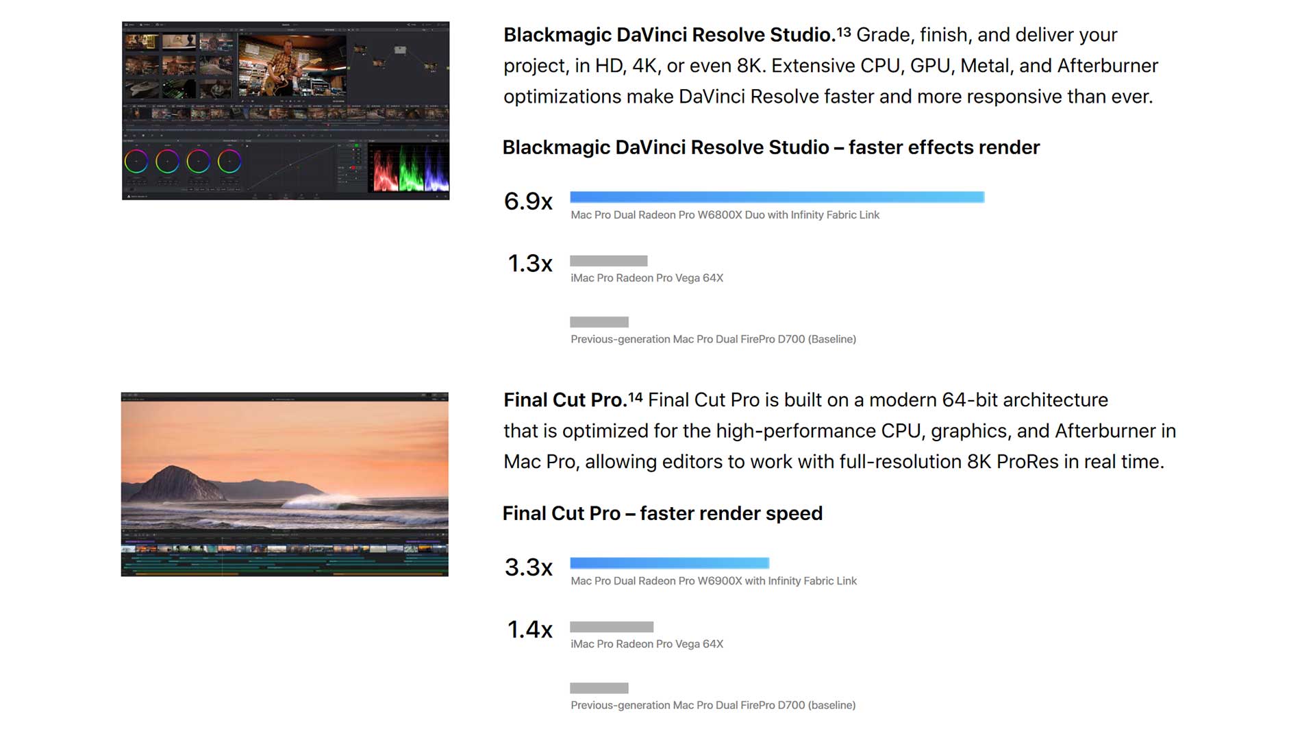 Final Cut Pro X sowie Blackmagic DaVinci Resolve sollen von den neuen GPUs, gerade in der Doppel-Option kräftig profitieren. Allerdings beruht der Vergleich auf einem iMac mit (alter) Vega-GPU und damit auch nur auf einer Einzel-GPU-Ausstattung.