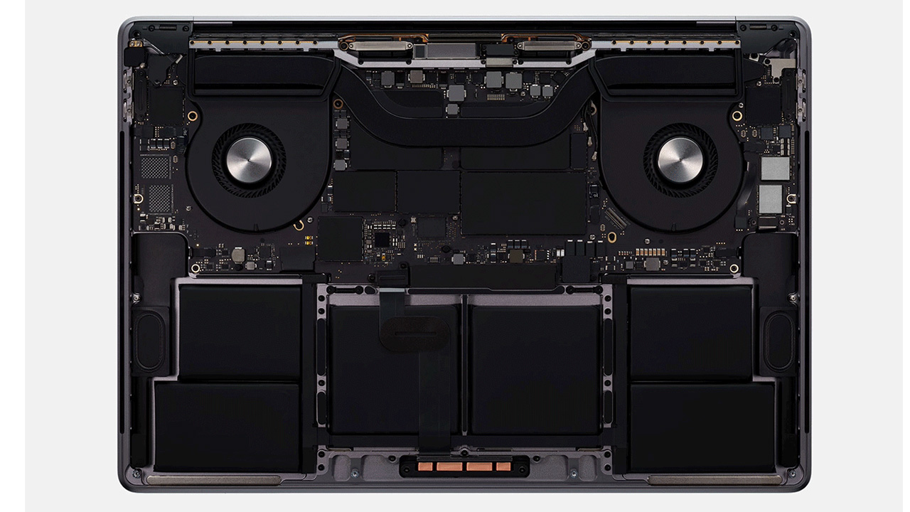 Gerade letzteres begrüßen wir dann doch sehr, hat uns die Tastatur bei den vorherigen beiden Modellgenerationen eben nicht mehr ganz so gut gefallen. Wir sind also gespannt, wie sich die neuen Tasten anfühlen, sobald wir dann selbst Hand an das neue MacBook Pro legen dürfen. Das neue Retina Display mit 40,65 Zentimeter Bilddiagonale arbeitet mit einem IPS-Panel für native 3072 x 1920 Pixel (226 ppi) und soll nach wie vor eine Helligkeit von bis zu 500 nits erreichen. Auch die Angabe des erweiterten „P3-Farbraums“ bleibt gleich, ohne dass Apple hier genauer ins Detail geht. Maximal werden 60 Hertz Bildwiederholfrequenz unterstützt, es ist ab Werk auf Gamma, Weißpunkt und Primärfarben kalibriert. Bei der dedizierten GPU hat man nun die Wahl aus einer AMD Radeon Pro 5500M mit bis zu acht Gigabyte GDDR6 RAM.