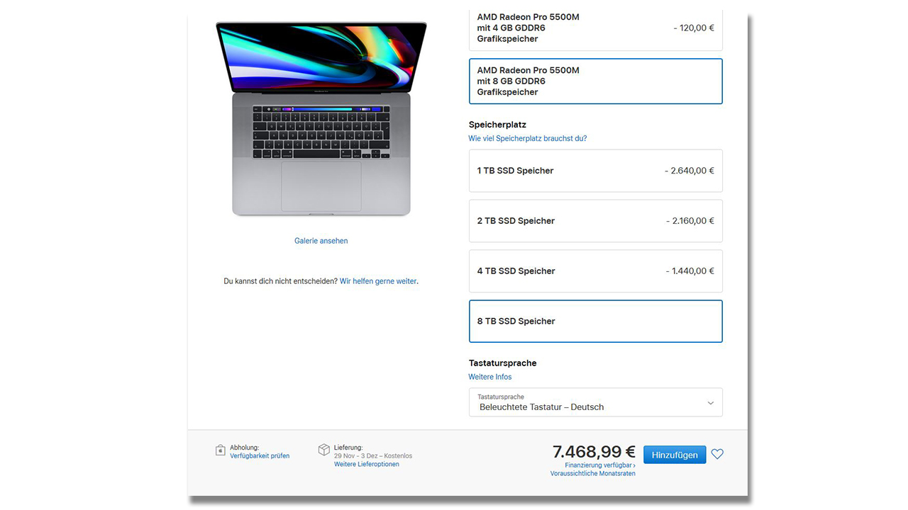 Standardmäßig setzt Apple hier jetzt auf eine Pro 5500M mit vier Gigabyte GDDR6 RAM. Bei der CPU bleibt es für die Topausstattung bei einem Intel Core i9 mit acht Kernen und 2,4 Gigahertz Takt. Standardmäßig packt Apple einen Intel i9 8-Kerner mit 2,3 Gigahertz ins 16 Zoll MacBook Pro. Beim Arbeitsspeicher sind in der Standard-Variante 16 Gigabyte DDR4 RAM angedacht, die man auf bis zu 64 Gigabyte erweitern darf. Als Massenspeicher setzt Apple auf eine ein Terabyte SSD, die auf bis zu satte acht Terabyte aufrüstbar ist. Der Aufpreis für die übergroße SSD liegt dann aber auch bei 2640 Euro – das am besten ausgestattete MacBook Pro kommt somit auf einen Gesamtpreis von rund 7469 Euro, wenn man noch ein Final Cut Pro X mit in den Warenkorb legt.