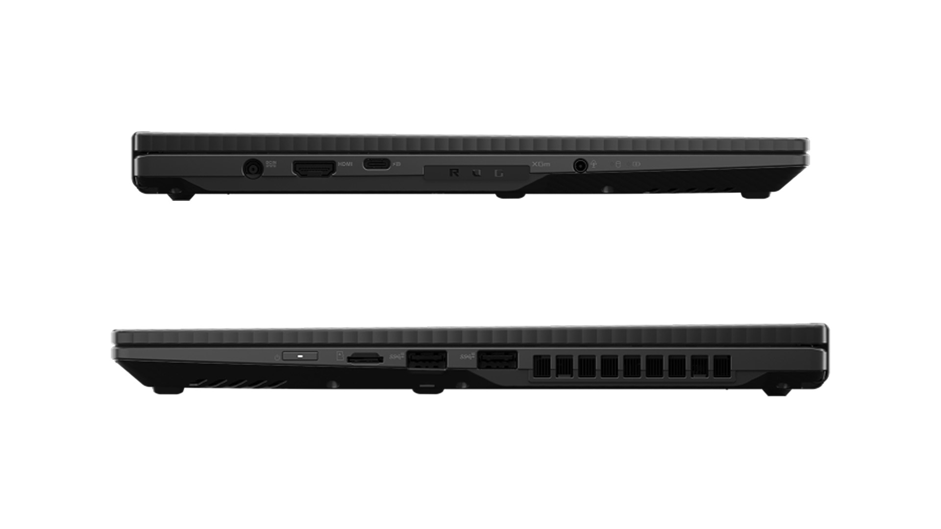 Die Anschlussleiste offeriert hier zweimal 3.2 Gen 2 Typ C (mit PD, nur einmal mit G-Sync), zweimal USB 3.2 Gen 2 Typ A sowie einmal HMDI 2.0b. Dazu kommt dann noch eine 3,5 Millimeter Audio-Kombibuchse sowie ein microSD-Kartenleser. Ein weitere Anschluss namens „ROG XG Mobile Interface“ ist proprietär und erlaubt die Verbindung mit einer externen GPU-Lösung, der ROG XG Mobile Station von Asus. Für alle Konfigurationen gilt ein 90 Wattstunden 4-Zellen-Li-Ionen-Akku.