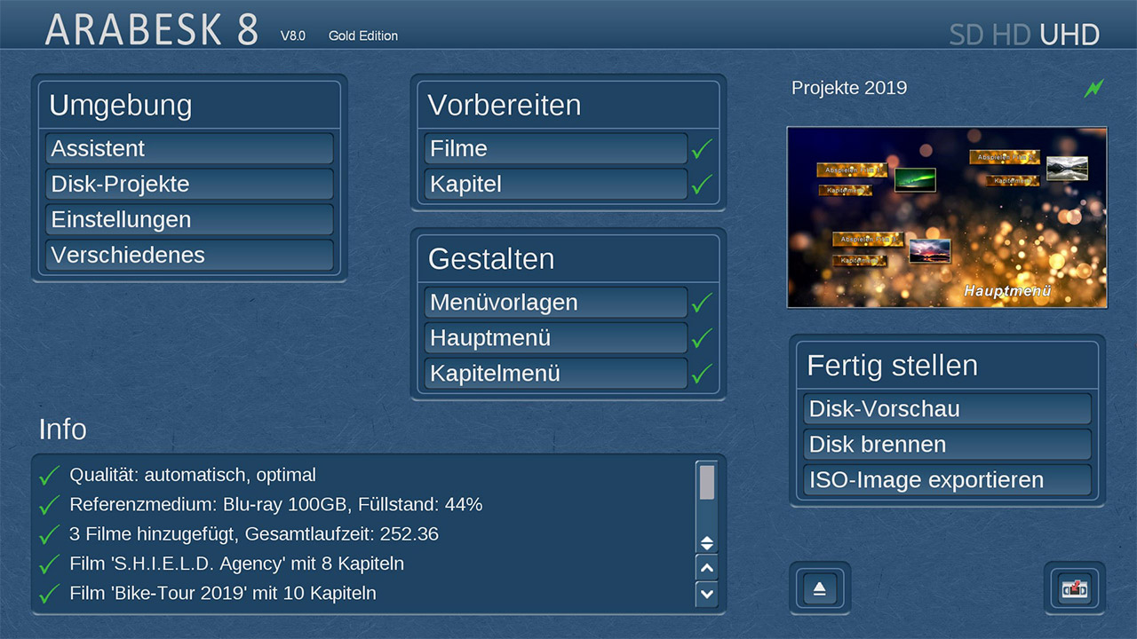 Das Bereits im März dieses Jahres angekündigte Update ist jetzt also endlich verfügbar. Damit das 4K-Disk-Mastering funktioniert, braucht man die Erweiterung „Arabesk“ in Version 8 womit sich dann UHD-Scheiben mit 3840 x 2160 Pixeln und Bildraten von 25, 30, 50 oder 60p mit HEVC/H.265-Codierung erstellen lassen. Erstmalig erlaubt die Software dabei bewegte Blu-ray-Haupt- und Kapitelmenüs zu erstellen und 4K-Filme in voller UHD-Qualität abzuspielen. Dabei lassen sich Rohlinge mit bis zu 100 Gigabyte Kapazität brennen, die laut Hersteller im „Beta-Test“ auf 4K-Blu-ray Playern von Sony, LG und Oppo funktioniert haben sollen. Auf Software-Seite kommt laut MacroMotion der PowerDVD 19 Ultra mit den UHD-Scheiben samt animiertem Menü zurecht. UHD-Spieler von Panasonic, Philips und Samsung verweigern indes die UHD-Disk von Arabesk 8 oder spielen diese ohne Menü.