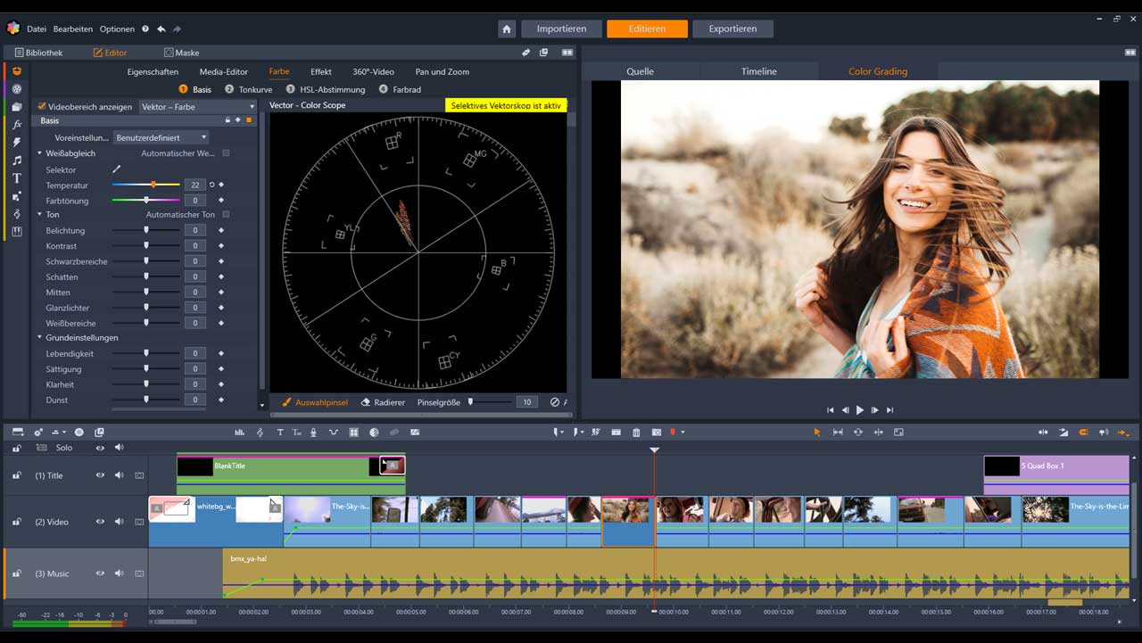 Mit der neuen Videomaskierung soll man Elemente aus einem Video entfernen, Gesichter unkenntlich und Elemente klonen können. Zudem kann man Aufnahmen mit Texten oder Formen überlagern und Textmasken erzeugen. Für das neue Color Grading liefert das Schnittprogramm entsprechende Steuerelemente für die Farbeinstellungen. Zudem sind Voreinstellungen für LUT-Profile enthalten und man kann einmal getroffene Clip-Einstellungen kopieren und sie somit auf andere übertragen. Mit dem „Selective Vectorscope“ soll man die Farbkorrektur für einen bestimmten Bereich besser optimieren können.