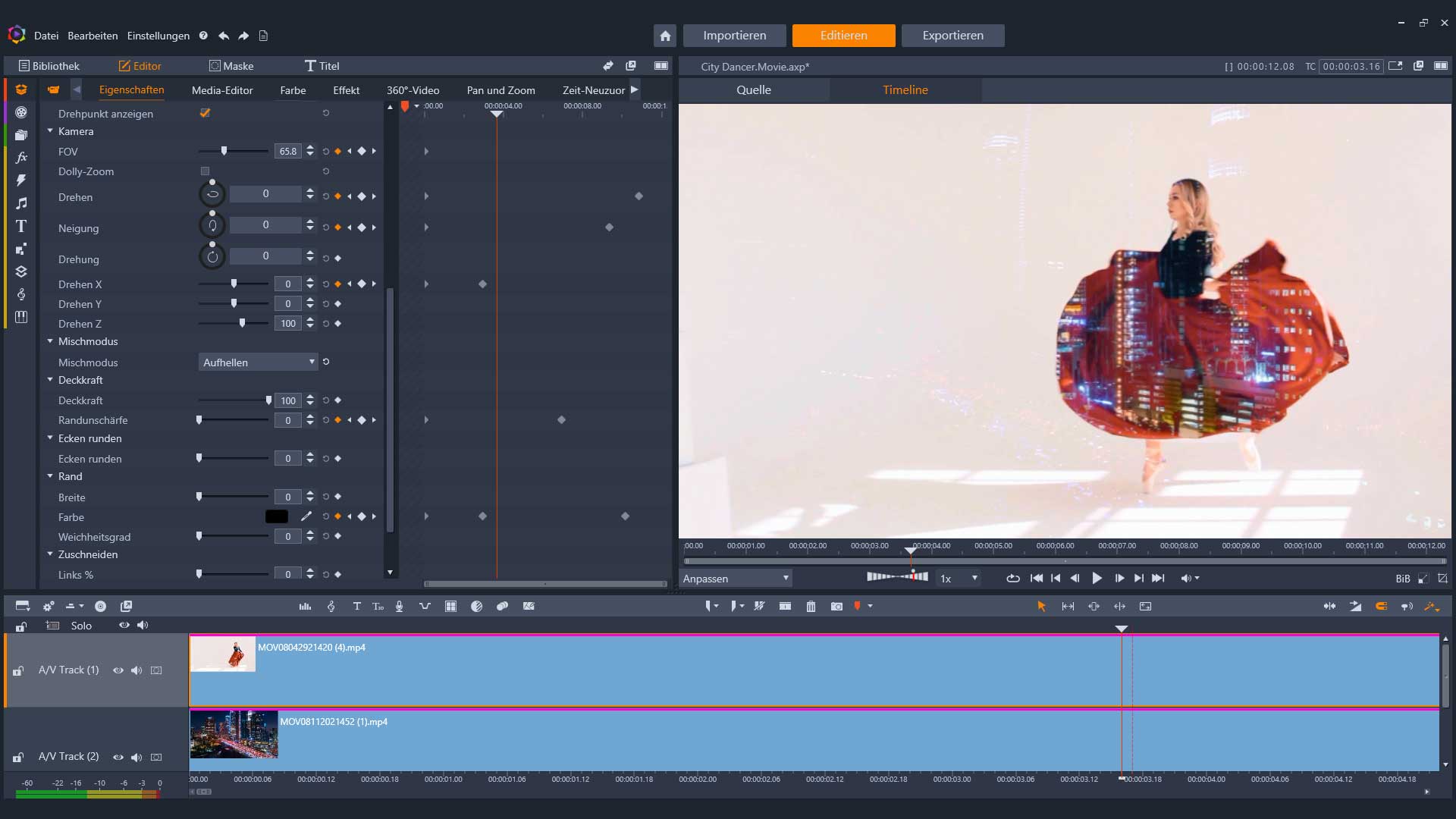 Bereits in Version 24 gab es die Gesichtserkennung und -verfolgung über das Masken-Tool. Die intelligente Objektverfolgung ist hier nun also offensichtlich eine erweiterte Variante der Gesichtsverfolgung, die nun auch für Objekte funktionieren soll. Bereits die Gesichtsmaskierung mit anschließender Verfolgung gelang in der Vorversion sehr gut. Wir sind also gespannt, wie die automatische Maskierung in Pinnacle Studio 25 dann jetzt mit Tieren, Autos und anderen Objekten gelingt. Weiter spricht Corel von neuen Überblendungsmodi mit denen sich Überlagerungseffekte, das Überblenden maskierter Bereiche sowie die Erzeugung von Lichtflecken und anderen Farb- und Belichtungs-Effekten realisieren lassen. Auch neue Audiofunktionen hat Pinnacle Studio 25 mit an Bord. Ab sofort ist die Rauschunterdrückung mit einem benutzerdefinierten Rauschprofil machbar.