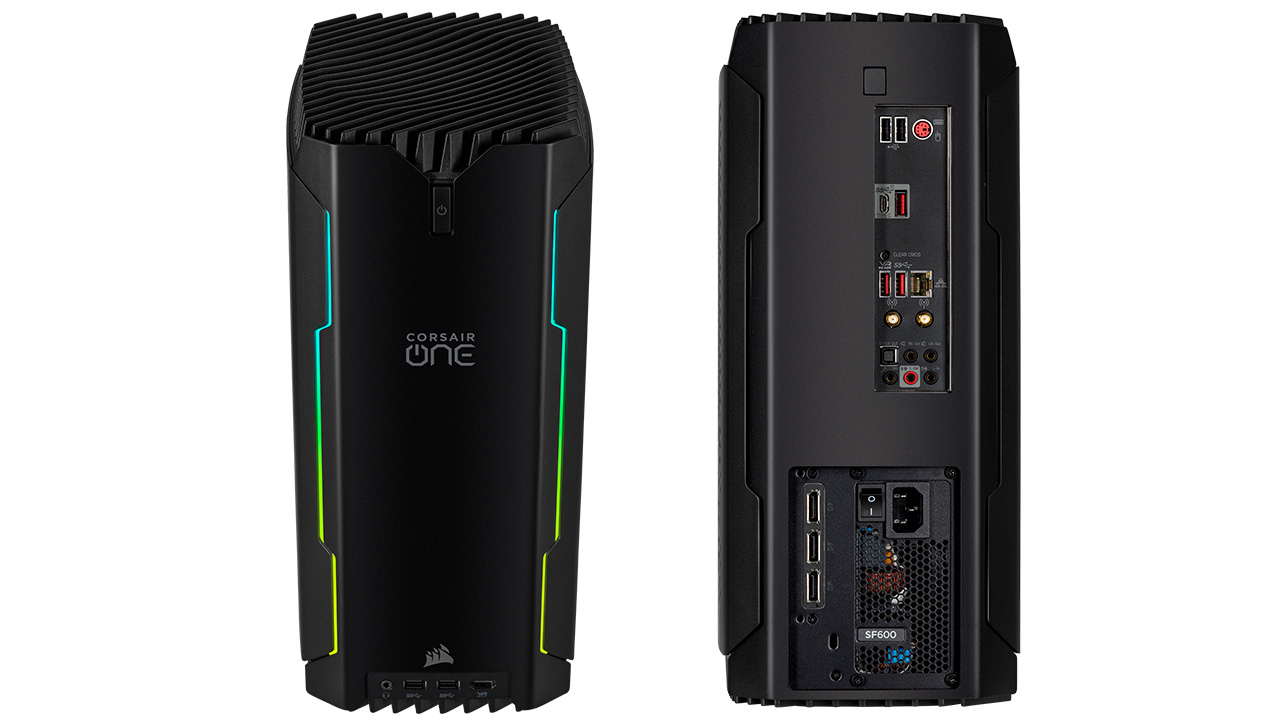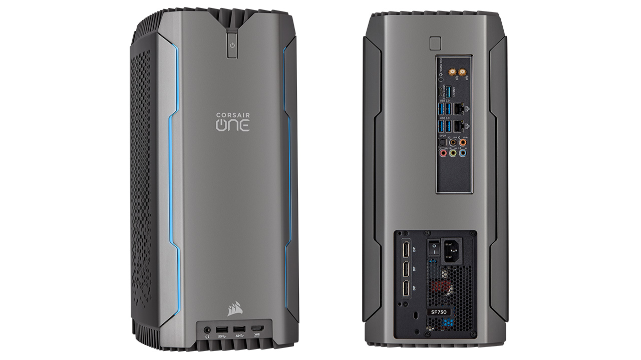 Der Corsair One Pro i182 arbeitet mit einem 750 Watt Netzteil und liefert unter anderem Anschlüsse für HDMI 2.0 sowie DisplayPort.