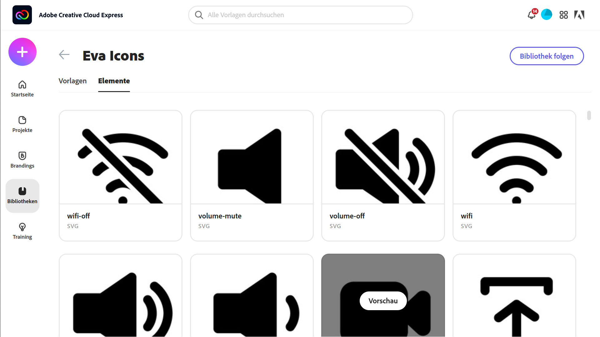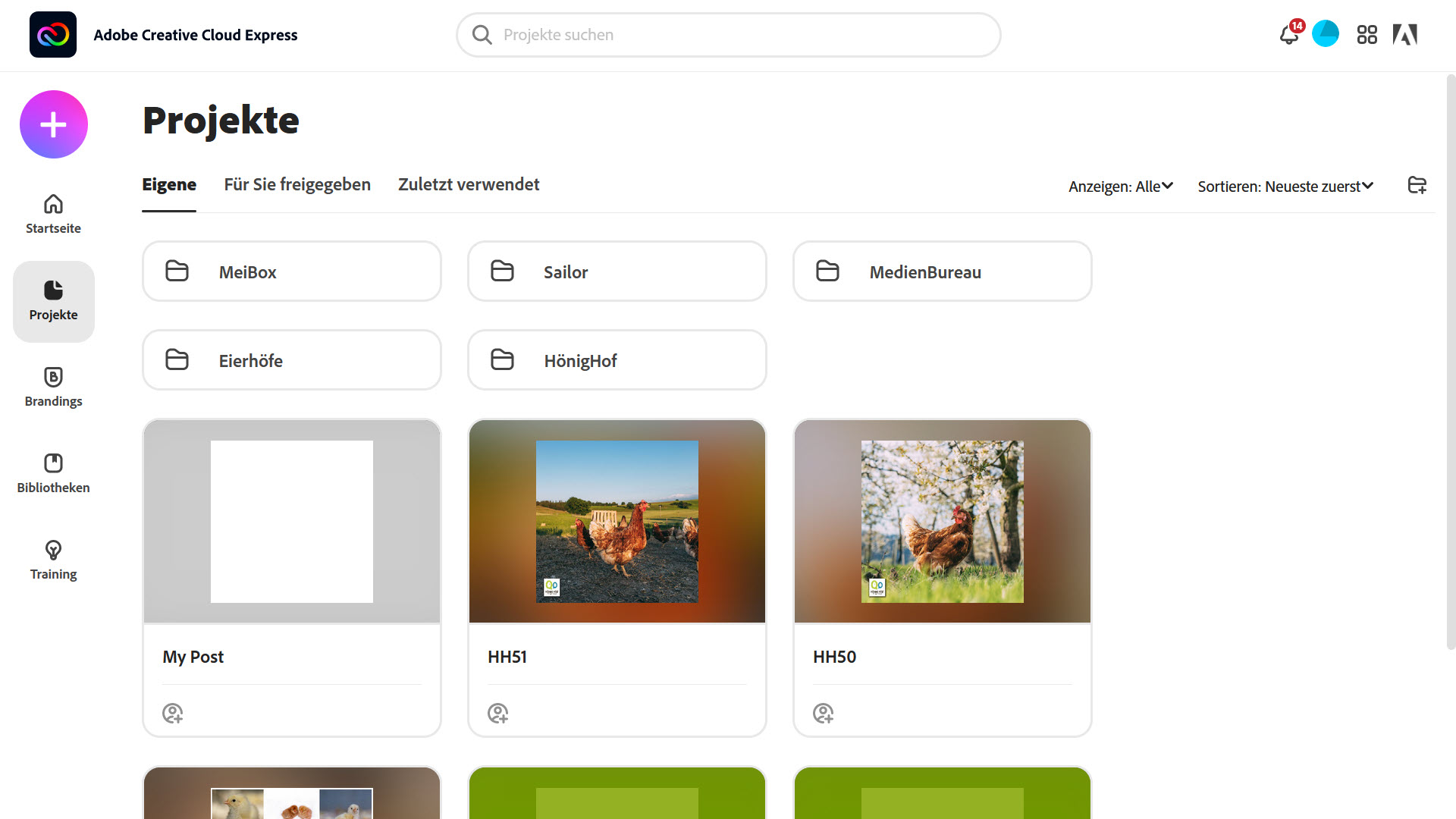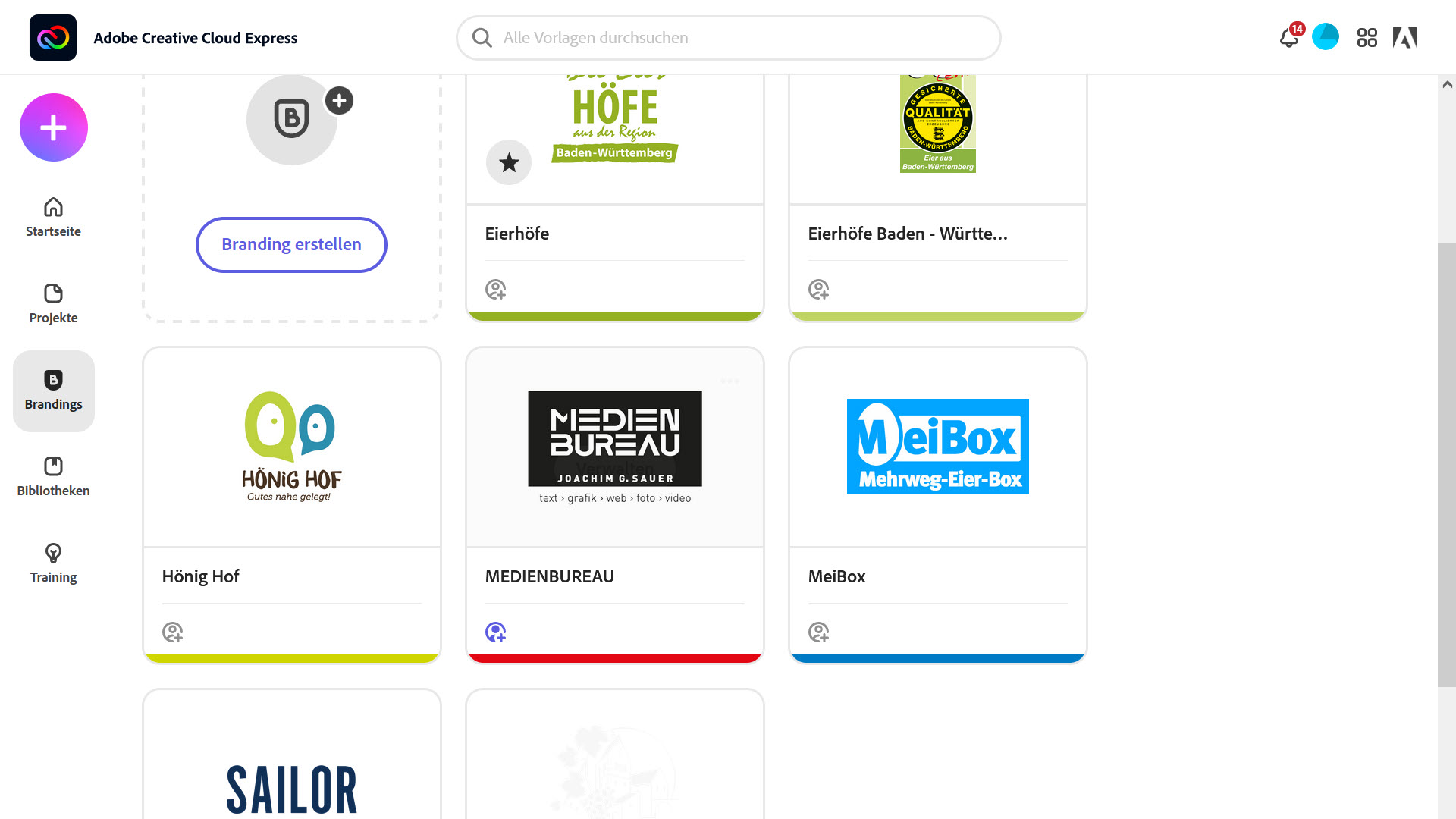 Wer bereits Vorlagen für verschiedene Marken (hier Brandings genannt) angelegt hat, kann auch in der Creative Cloud Express damit arbeiten. Wer die komplette Creative Cloud Suite gebucht hat, erhält weiterhin Zugriff auf die Online-Toolbox.