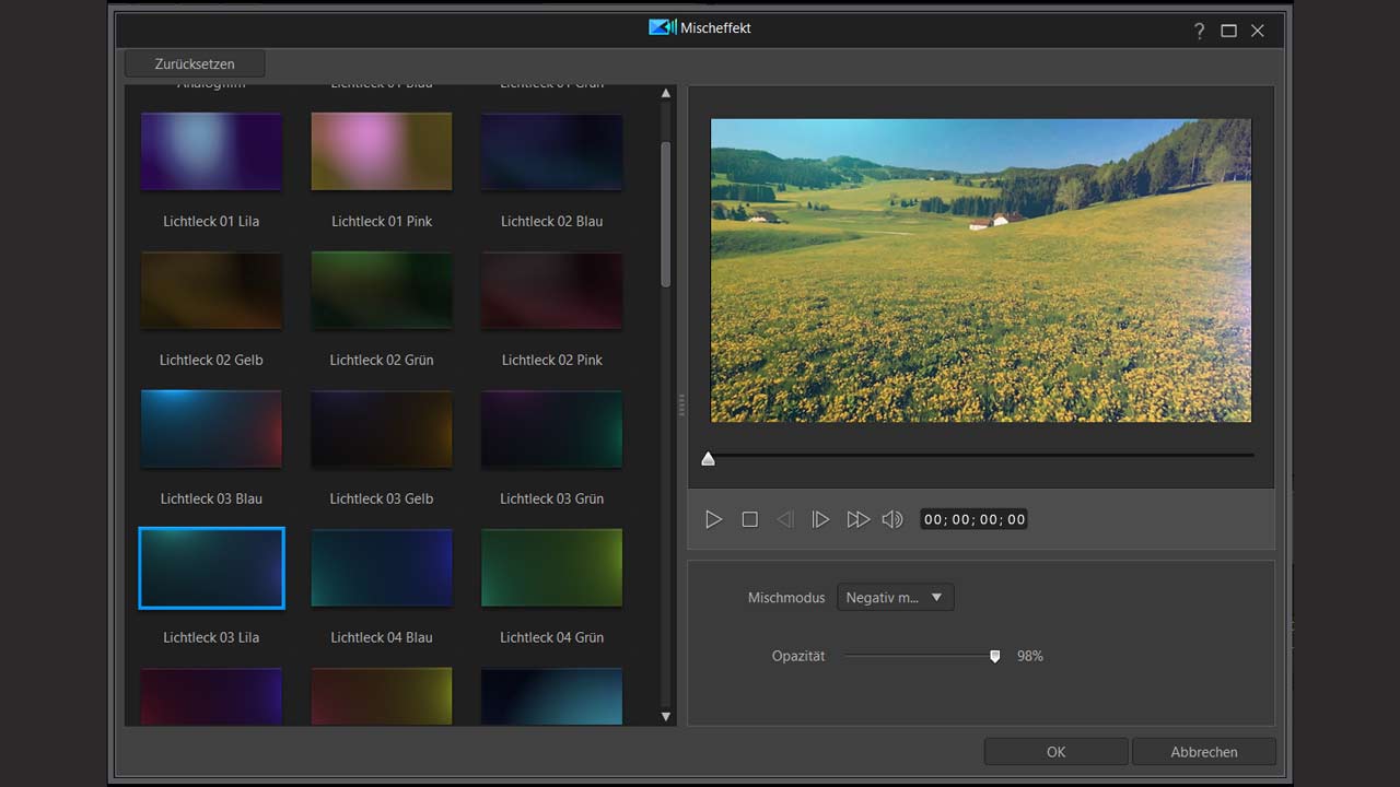 Doch der Hersteller liefert auch neue ein neues Lichtleck Mischpaket mit einer Sammlung an Lichteffekten. Mit insgesamt 48 Überlagerungen – 12 Effekte und vier Farbvariationen – können Szenenübergänge des Videos weich gestaltet werden. Oder es lassen sich je nach Video-Content Vintage- oder Traum-Effekte bei den Übergängen einspielen.