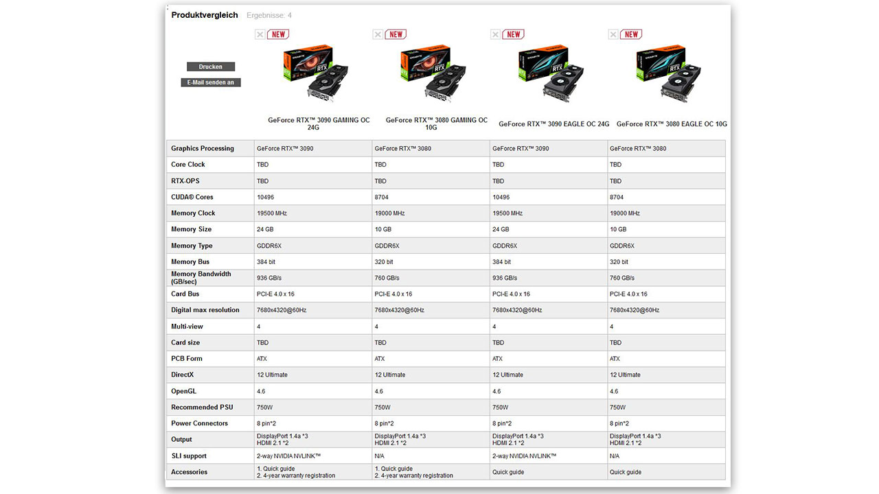 Im Direktvergleich sieht man die genauen technischen Daten der neuen RTX 3090 und RTX 3080 von Gigabyte und kann diese vergleichen.