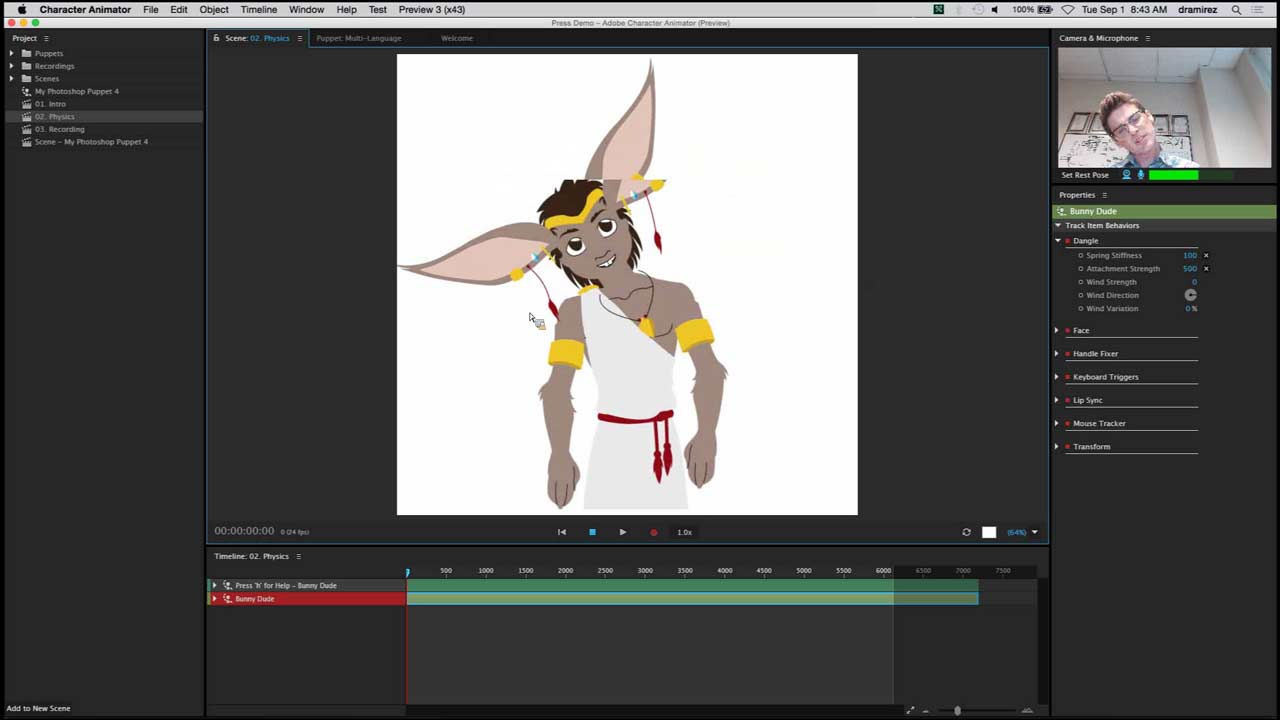 Beim Character Animator versucht mehr Praxisrelevanz zu erreichen und setzt dabei auf die meist an Arbeitsplätzen verfügbaren Webcams, über die man nun die Kopf- und Mundbewegung einer vorher gezeichneten Grafik animieren kann. Bedingung ist allerdings, dass man die Grafik via Photoshop integriert, wobei man die Ebenen nach einem bestimmten Muster benennen muss. Die Animation läuft dann indem man in der Character Animator-Timeline das Recording startet und dann die entsprechenden Bewegungen für die Figur ausführt. Der Export aus dem Animationswerkzeug gelingt als Flash mit Alpha-Kanal, so dass man es in Premiere Pro oder After Effects integrieren kann. Die Flash-Datei lässt sich aber auch über Media Encoder auch direkt berechnen.